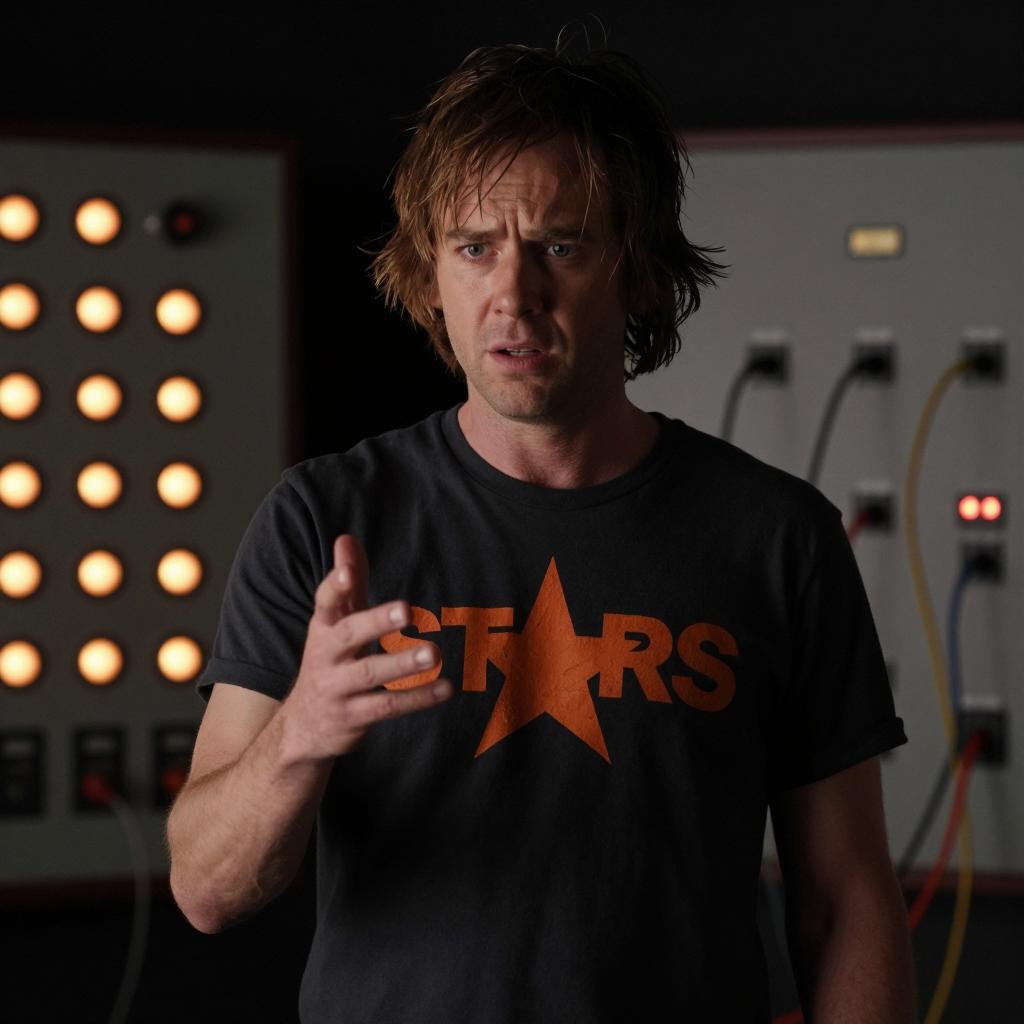 Man with shaggy brown hair, wearing a black T-shirt with orange "PORNSTARS" , gesturing with right hand. Dark room, control panel with orange lights on left, tangled colorful cables on right. He has a slightly annoyed expression. Movie still.