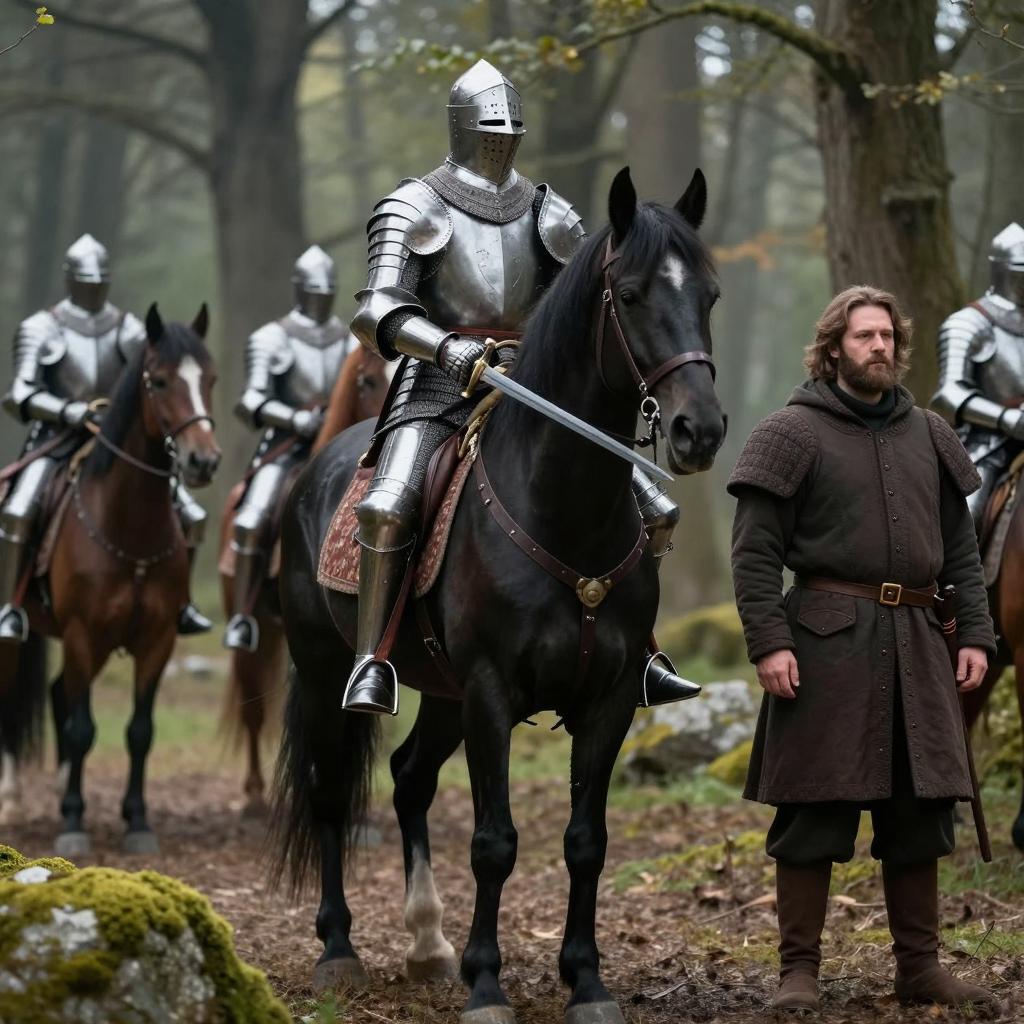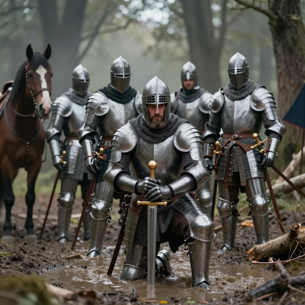 Medieval battle scene photograph. Central woman in silver armor, pink tunic, and beige pants, drawing sword. Two armored men with red capes on left and right, attacking. Brown horse with red blanket in background. Grass field. Fallen sword on ground. Woman in mid-action stance, intense expression. Two men in mid-attack, determined expressions.