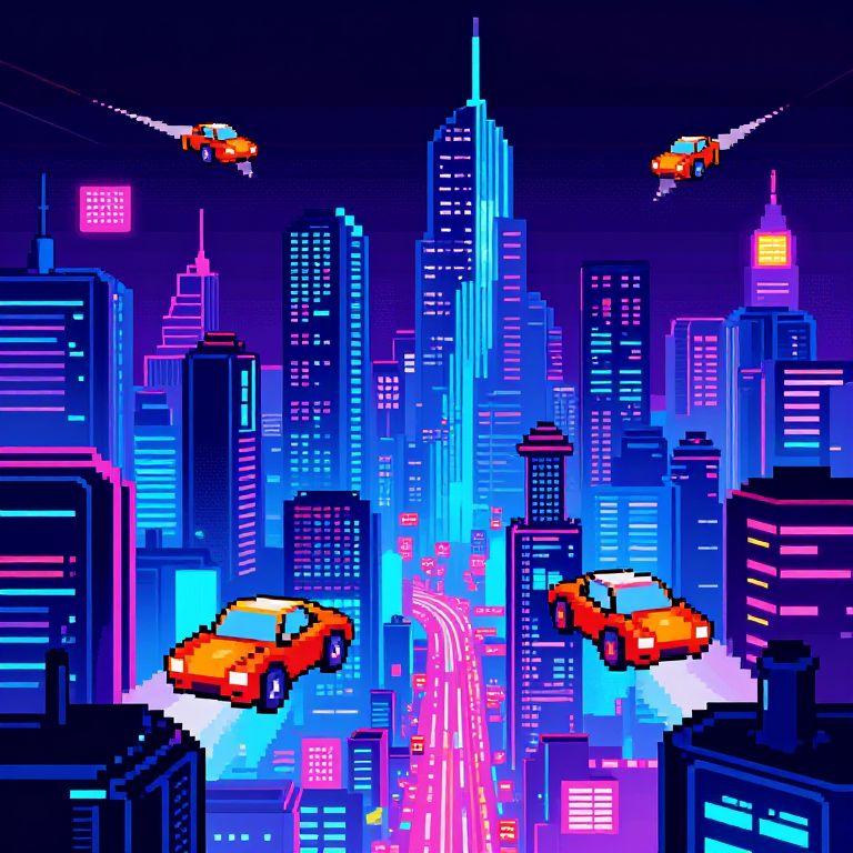 Image to pixel art of a futuristic cityscape with neon lights and flying cars, cyberpunk theme, high contrast bright colors and detailed pixel blocks, dynamic and immersive pixel art style, inspired by classic arcade games.