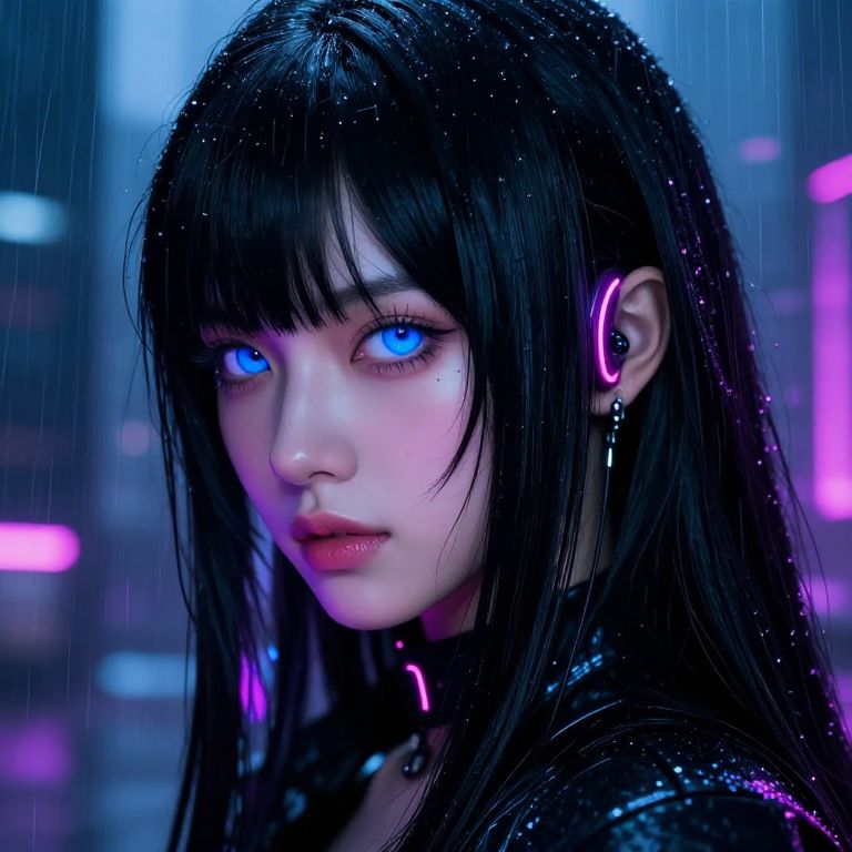 Long black hair blue eyes close-up of a futuristic cyberpunk character with sleek neon accessories, rain-soaked cityscape backdrop, dramatic lighting emphasizing glossy hair and vivid eyes, intricate digital art style with high contrast and vibrant hues