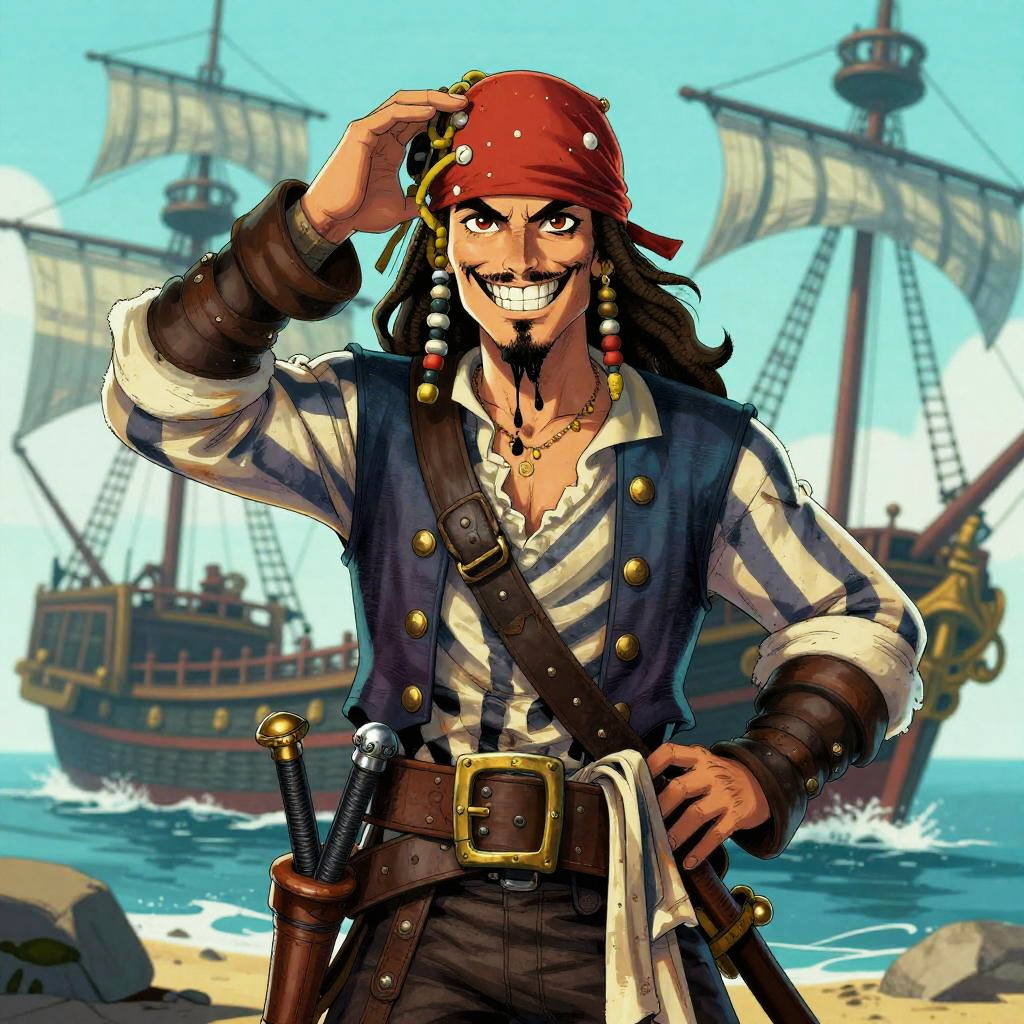 Pirate character art illustrating a young swashbuckler with a mischievous grin, wearing a striped shirt, bandana, and multiple belts loaded with weapons, standing confidently with a shipwreck in the background, styled with vibrant colors and comic book flair.