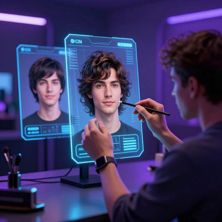 Photograph of a man with curly brown hair digitally editing his face on a glowing blue holographic screen. He holds a stylus, with a mirror