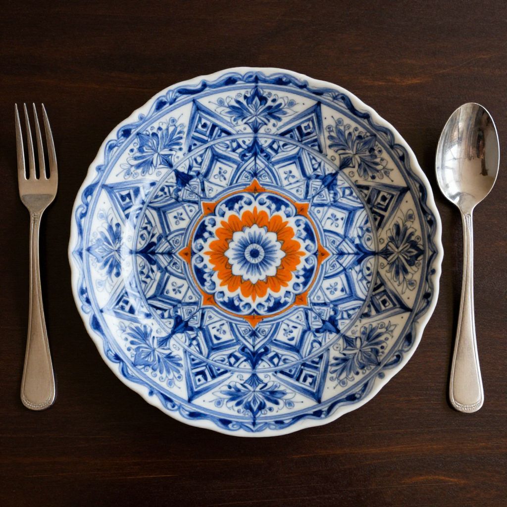 The image showcases a beautifully hand-painted dinner plate with intricate designs, featuring a central medallion adorned with a vibrant orange and white floral pattern. Surrounding the medallion is a complex array of blue and white geometric and floral motifs, creating a harmonious and symmetrical composition. The plate is placed on a dark wooden surface, enhancing the contrast and making the colors of the design stand out. To the left of the plate, a silver fork and knife are neatly aligned, while a spoon rests to the right, all arranged in a balanced and elegant manner. The overall arrangement suggests a sophisticated dining setting, with the plate's detailed hand-painted design as the focal point.