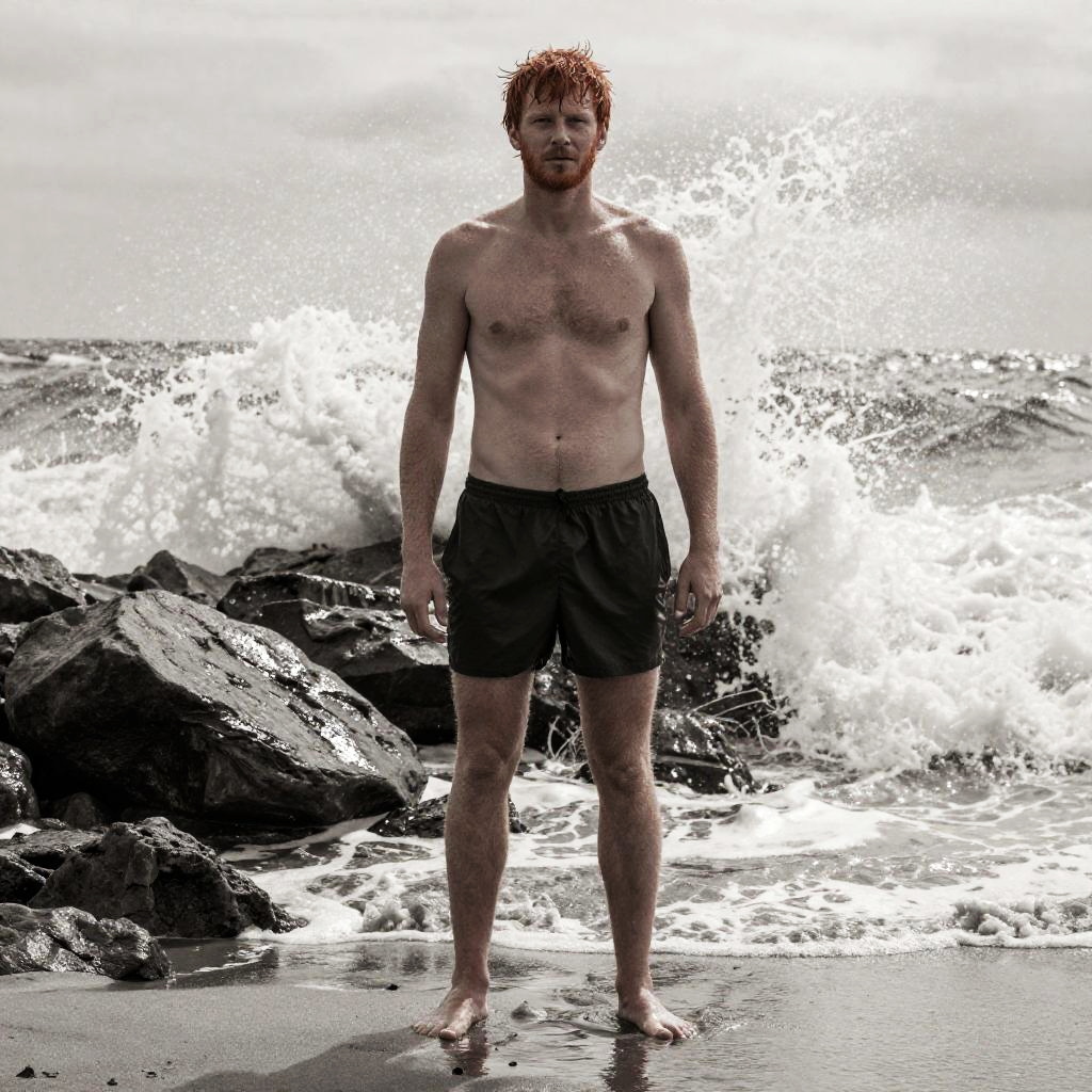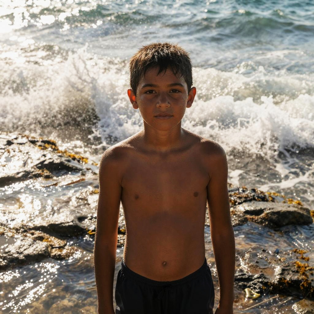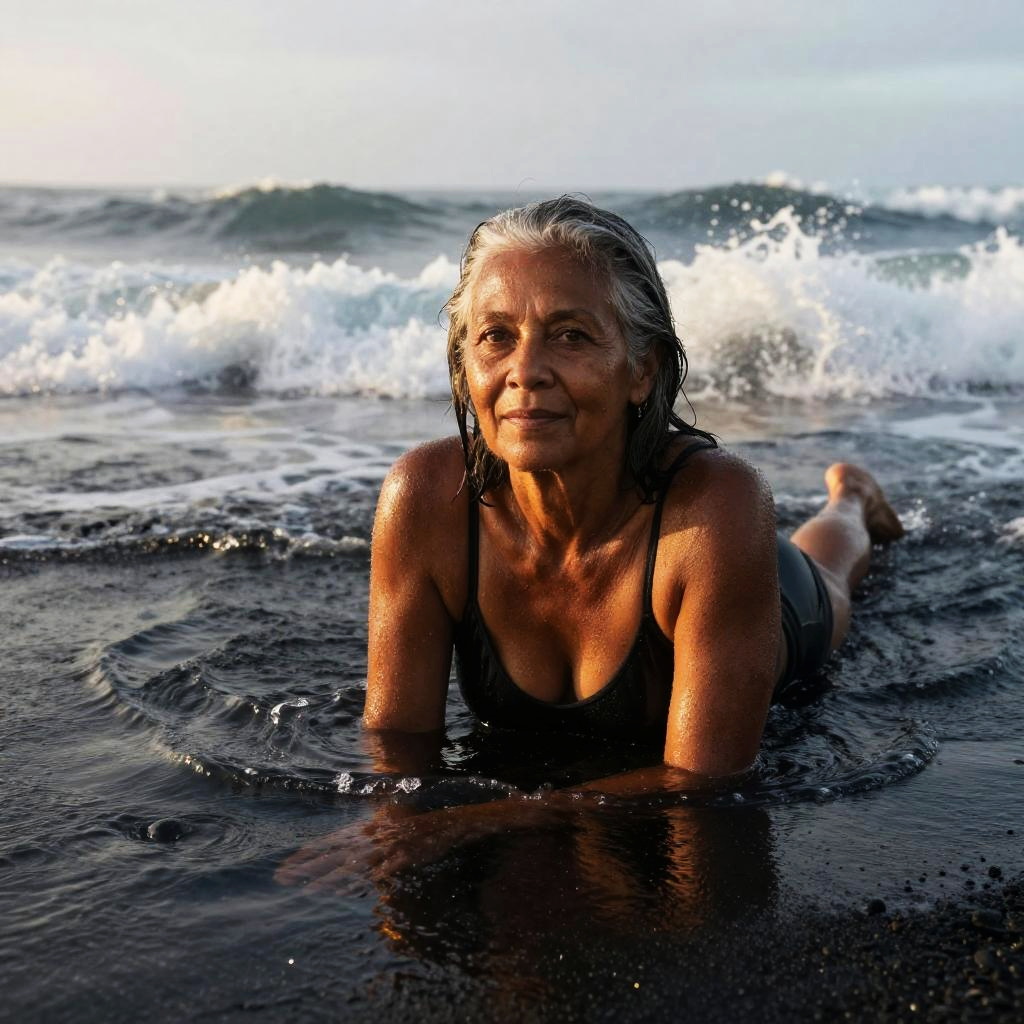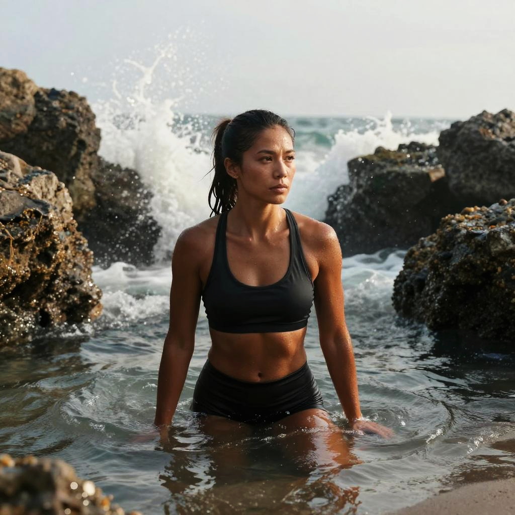 Photograph of an adult athletic olive-skinned woman with a ponytail, at a quiet lagoon surrounded by jagged rocks, waves crashing behind, sea spray backlit, wet hair detail, dramatic golden glow on skin, reflective wet sand, high contrast, deep depth of field, crisp water texture, determined expression, balanced composition, subtle film grain, natural pores, coastal atmosphere, sporty editorial with high contrast.