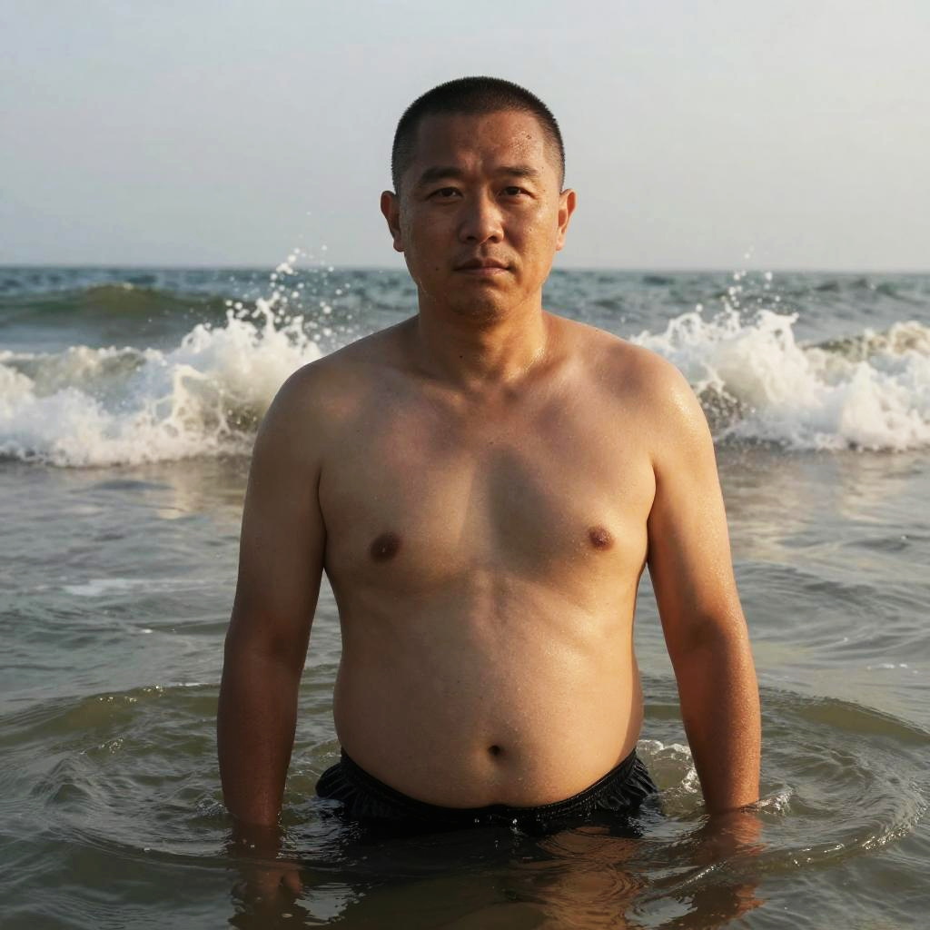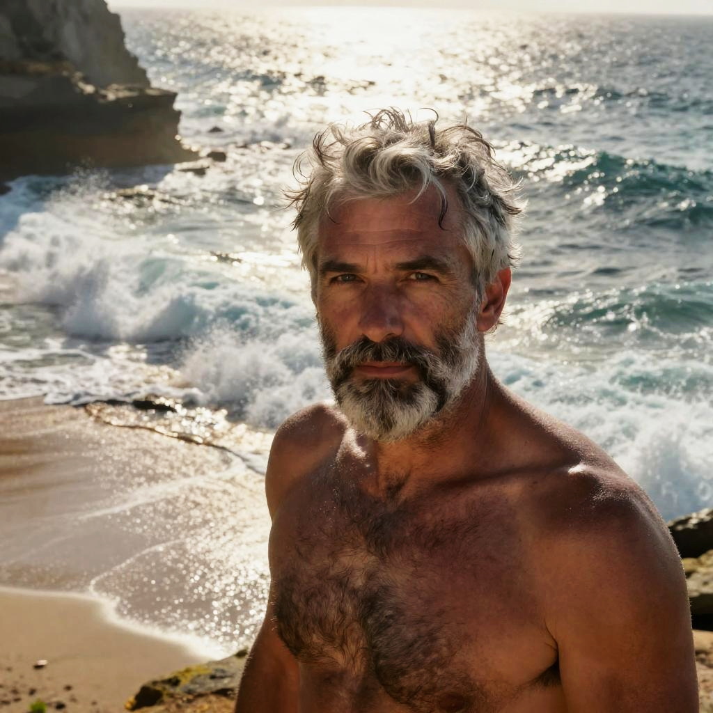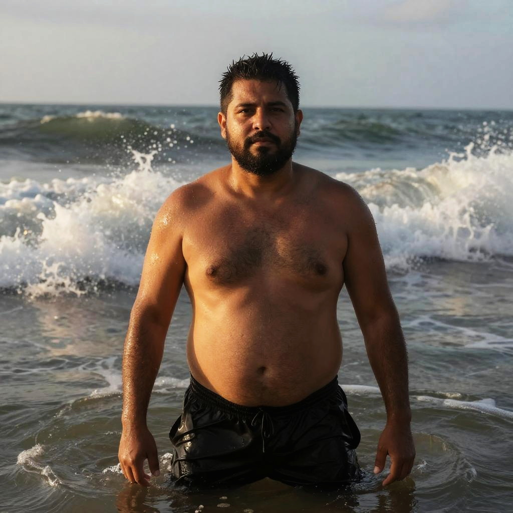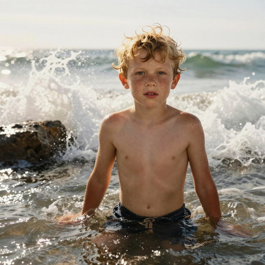 Photograph of an adult athletic olive-skinned woman with a ponytail, at a quiet lagoon surrounded by jagged rocks, waves crashing behind, sea spray backlit, wet hair detail, dramatic golden glow on skin, reflective wet sand, high contrast, deep depth of field, crisp water texture, determined expression, balanced composition, subtle film grain, natural pores, coastal atmosphere, sporty editorial with high contrast.
