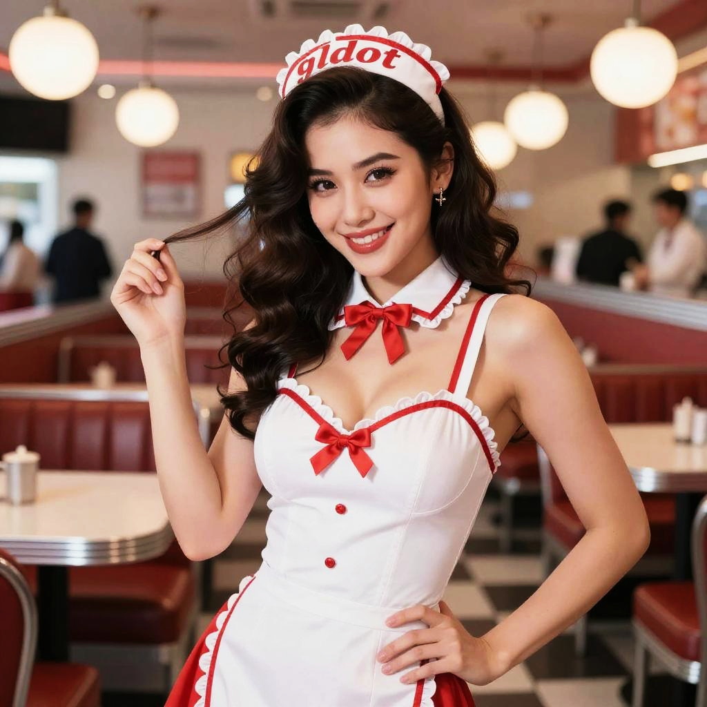 Waist-up portrait of a smiling young Asian woman dressed as a 1950s style pinup waitress in a retro diner. She wears a white waitress uniform with red trim and bows, including a matching headpiece with 'gldot' written on it. The diner interior features red booths, checkerboard floor tiles, and soft round pendant lights. The image is highly detailed with sharp focus and soft lighting, highlighting the waitress's curled dark hair and bright makeup.