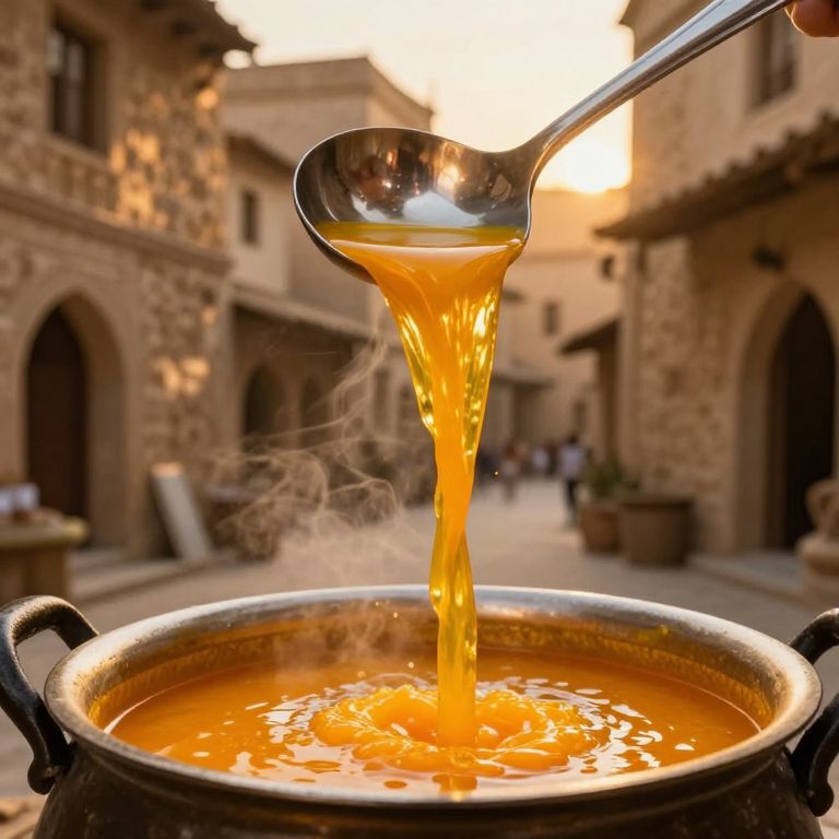Photograph of a golden, translucent honey-like liquid pouring from a metallic spoon into a brass pot filled with more of the liquid. The scene is set in a sunlit, narrow, stone-facade courtyard with arched doorways and potted plants in the background. The liquid is viscous, with visible steam rising, indicating warmth. The pot has ornate handles and is centered in the foreground, while the blurred courtyard adds depth to the image. The overall color palette includes warm golds and browns.