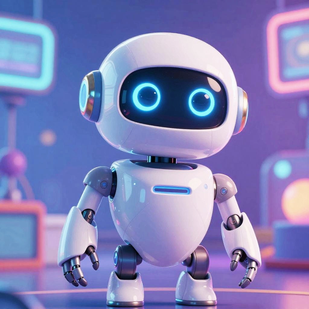 Pixar style AI character, friendly and futuristic robot with expressive eyes and smooth rounded design, vibrant colorful environment, digital art, soft lighting, whimsical yet high-tech atmosphere, intricate details on AI circuits and playful pose