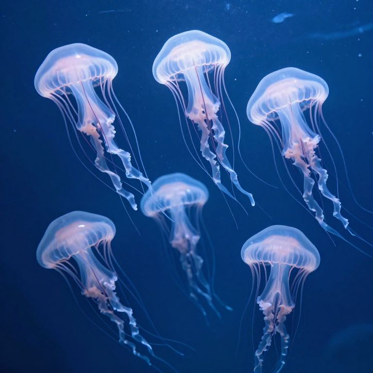 Five ethereal jellyfish drift gracefully through a serene underwater forest, their translucent bodies glowing softly as their delicate tentacles sway hypnotically in the deep blue waters.