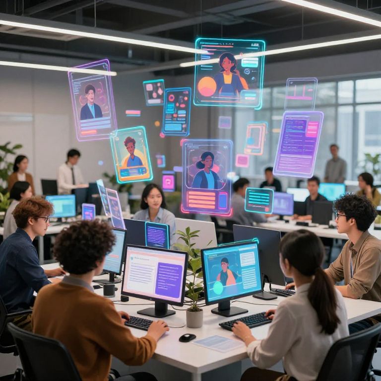 Photograph of a modern office with diverse employees working on laptops, illuminated by holographic portraits and virtual interfaces hovering above. Bright, futuristic workspace with p