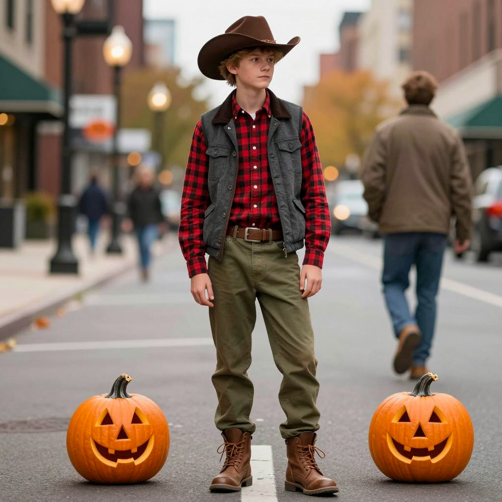 West side story halloween, photorealistic, boy standing on street, wearing cowboy hat, red checkered shirt, gray vest, olive green pants, brown boots, daytime, urban setting, blurred background, man walking away, two jack-o'-lanterns, autumn, casual outfit, HDR, street lamp, soft lighting, slight bokeh effect, young male, relaxed pose, realistic ures, warm colors