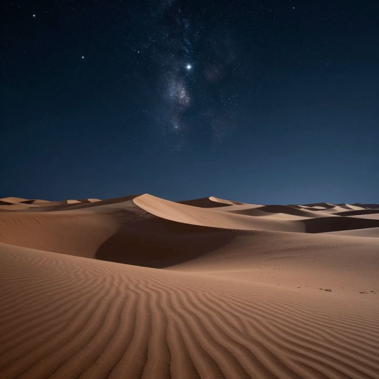 Photograph of a starry night desert landscape. The foreground features rippled, sandy dunes with warm, orange-brown tones under soft moonlight. Midground has gently rolling sand waves, while the background transitions to a deep blue, star-studded sky. The Milky Way galaxy is prominently visible, stretching diagonally across the sky. The image captures the texture of the sand and the serene, peaceful atmosphere of the desert under a clear night sky.