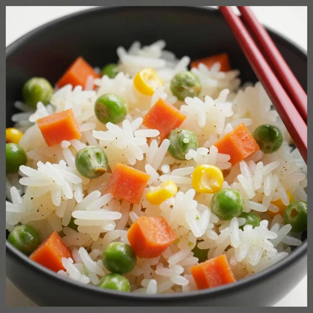 Close-up photo of a black rectangular bowl filled with fluffy white rice mixed with bright green peas, small orange carrot pieces, and scattered bits of yellow corn. Red chopsticks rest on the right side of the bowl. The image has a gray border and the focus is sharp on the rice mixture, highlighting its textures and colors.