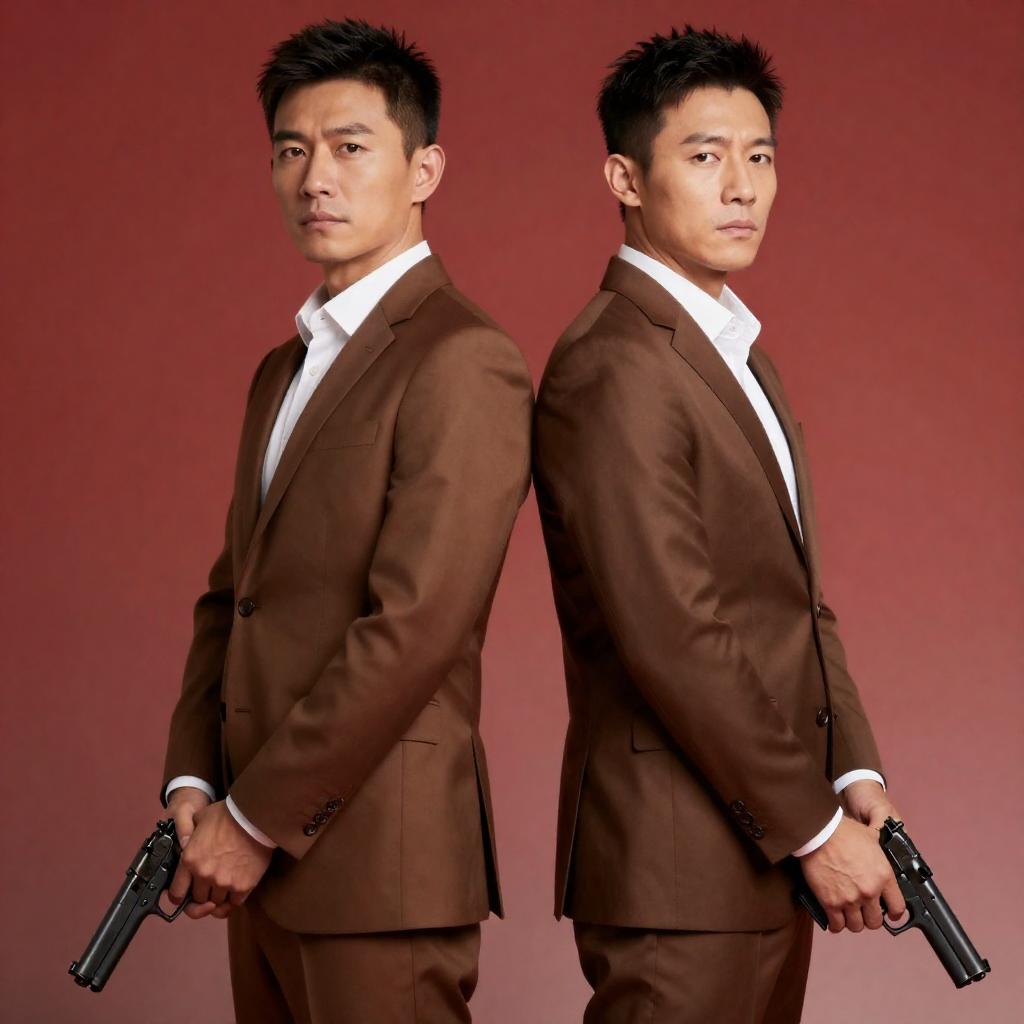 Photograph of two Asian men in a smoky, industrial warehouse. Front man in green blazer, unbuttoned shirt, black pants, serious expression. Rear man holding rifle, brown jacket, white pants, focused expression. Red lights, crates, and debris in background.
