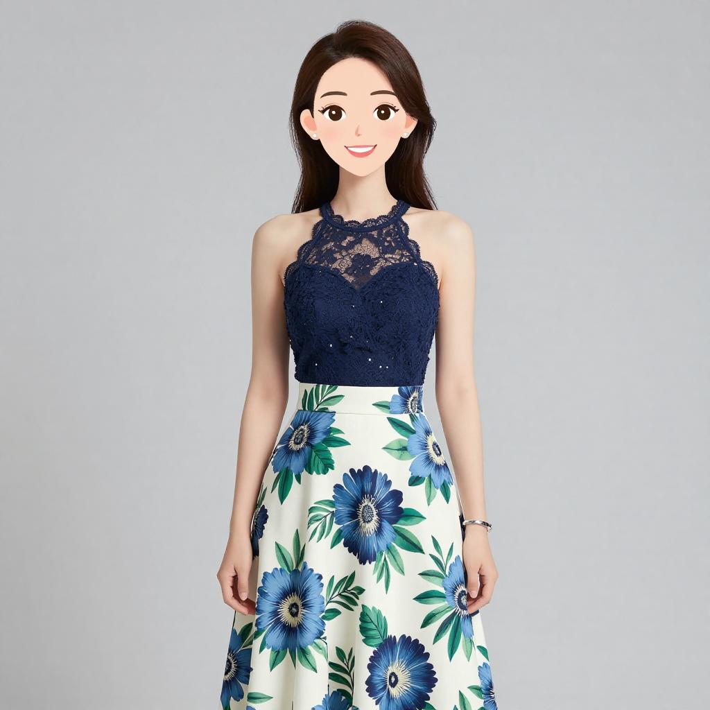Woman with pretty face and pretty hair. smiling Woman, contemporary formal, navy blue lace halter top with scalloped edges and sequin embellishments, high-waisted floral print skirt in white with blue and green patterns, full-length and pleated, simple silver bracelet, stud earrings, hair styled in a half-up, half-down fashion, plain light grey studio background. --sref 1467