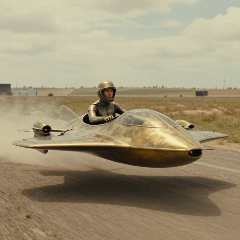 "Bronze Sculpture cinematographic, flying speeder race, Still from a surrealist retro sci fi movie from Wes Anderson, golden ratio,"