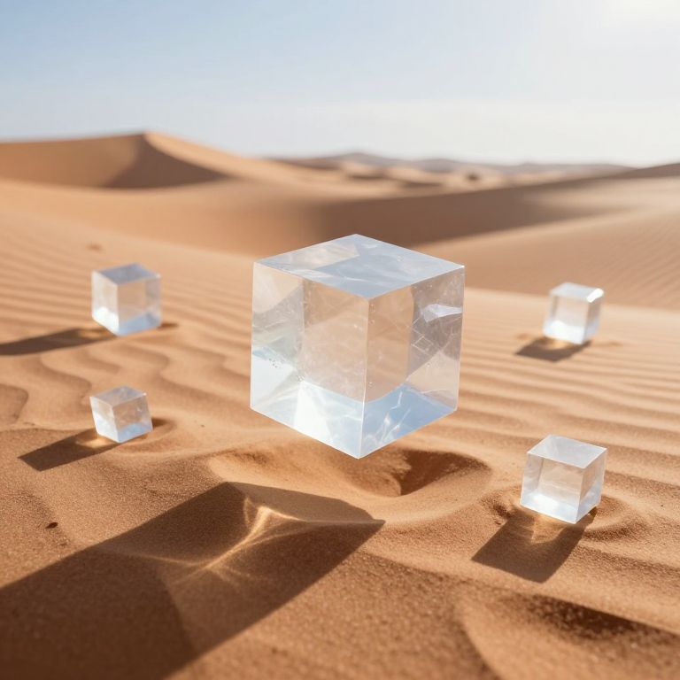Translucent crystalline cubes float serenely atop rippling sand dunes, refracting sunlight into ethereal patterns in this otherworldly desert landscape.