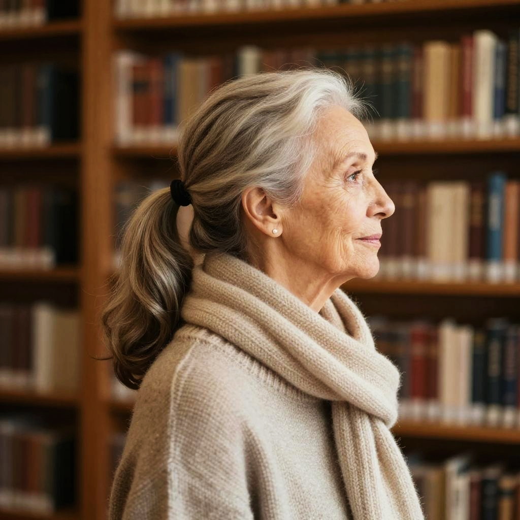 Classic Ponytail hairstyle on elderly woman, wearing cozy sweater and scarf, in library interior, captured in fashion editorial style with soft warm glow.