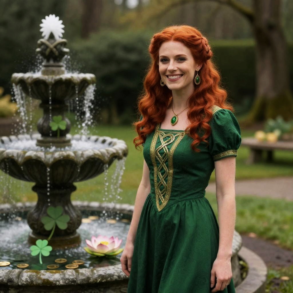 Depict an smiling beautiful Irish woman with red Celtic hair style, Celtic green dress, in an Irish forest. standing beside a cascaded fountain filled with gold coins, shamrock, lotus, and Celtic decorations. ultra-realistic, 3 dimensional, high dynamic range.