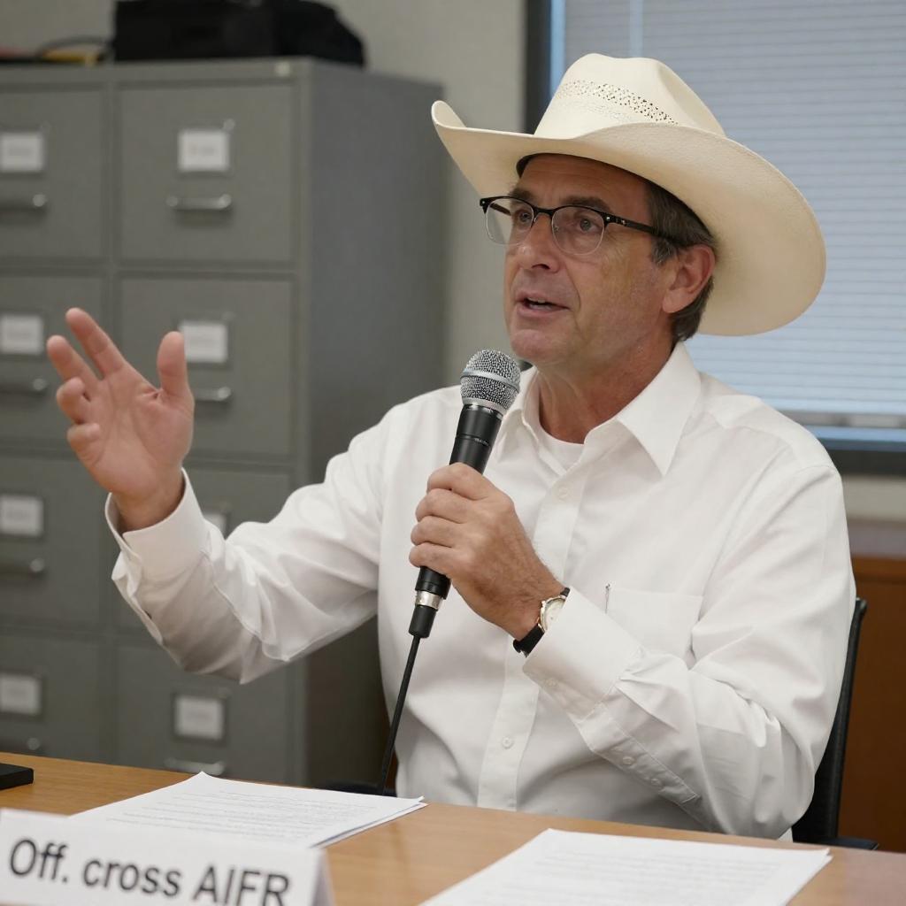 Photograph of a middle-aged white man with glasses, wearing a white cowboy hat and shirt, gesturing with his right hand while holding a black microphone. He sits at a wooden desk with papers and a nameplate reading "Off. Cross AIFR." Office background includes filing cabinets and a window with blinds.