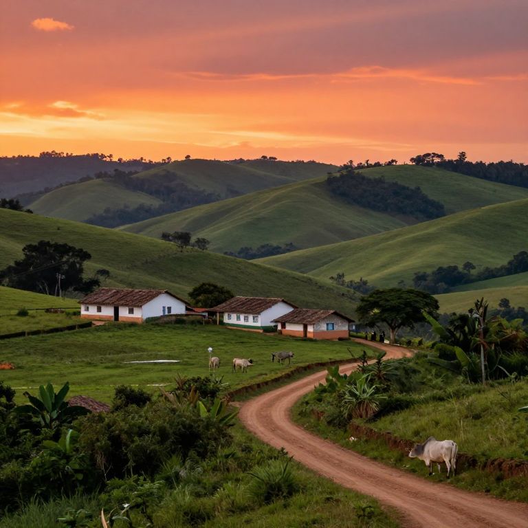 Mineiro rural landscape at sunset, traditional Brazilian farmhouses nestled among rolling green hills, vibrant orange and pink sky, cattle grazing peacefully, rustic dirt roads winding through lush vegetation, warm and inviting atmosphere, detailed and textured scenery
