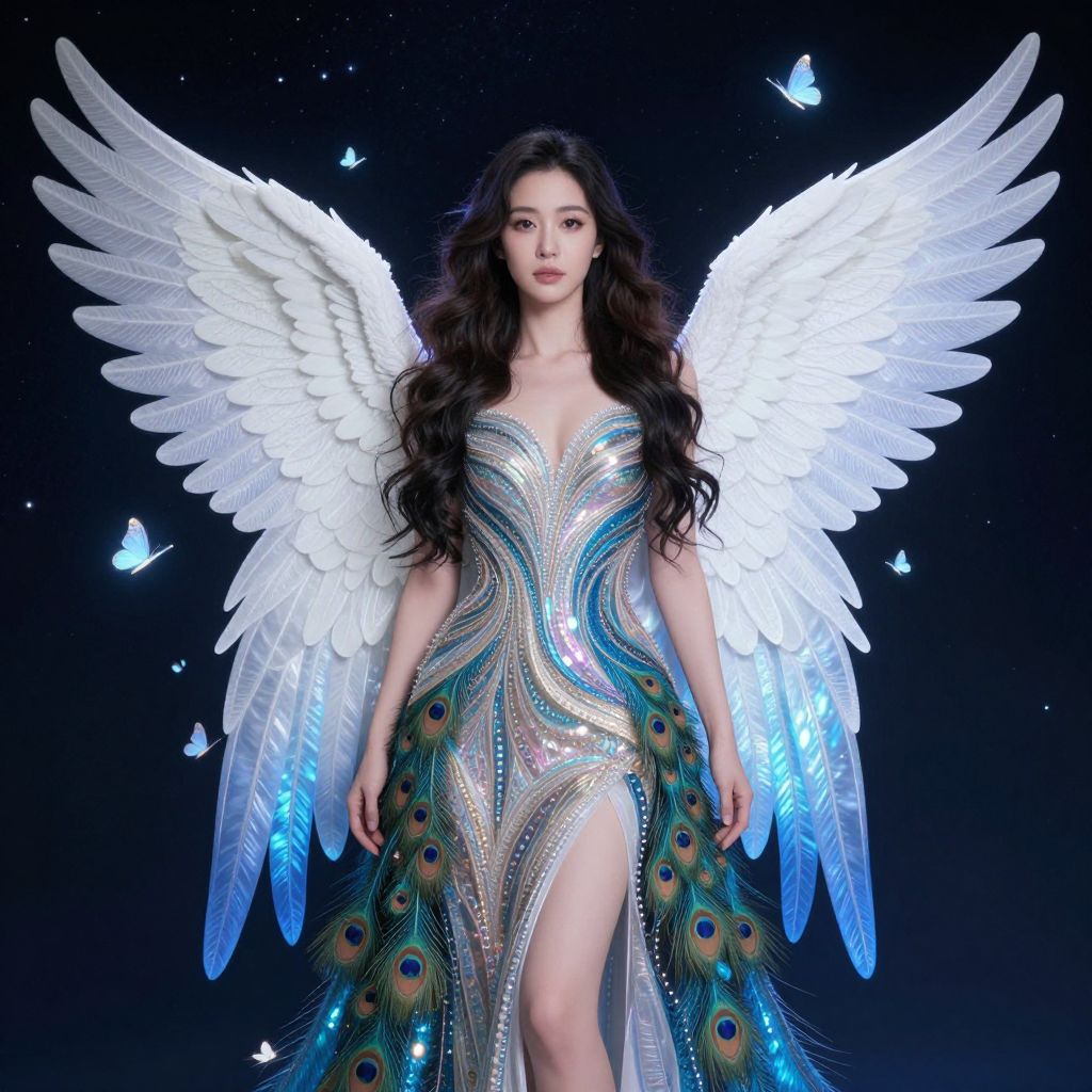 The image presents a detailed portrait of a woman with long, wavy hair cascading down her shoulders. She is adorned in a peacock-inspired dress, featuring intricate patterns and a shimmering, iridescent texture. The dress is complemented by a large, white, iridescent wing that extends from her back, blending seamlessly with the background of a starry sky. The wings are detailed with delicate patterns and a gradient of colors, transitioning from a soft white at the base to a deep blue at the tips. Surrounding the woman are numerous small, glowing butterflies, adding a magical and ethereal quality to the scene. The overall composition is balanced, with the woman centrally positioned, the wings and butterflies creating a harmonious and dynamic interplay of elements.