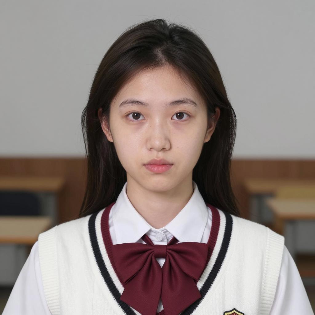Costume thick woman, photo of an attractive young woman, Asian, long dark hair in a high ponytail, serious expression, wearing a white button-up shirt with brown suspenders, soft natural light, gray background, realistic, portrait, slight shadow on the right, casual style, upper body, minimal makeup, clear skin, slim build, smooth ures