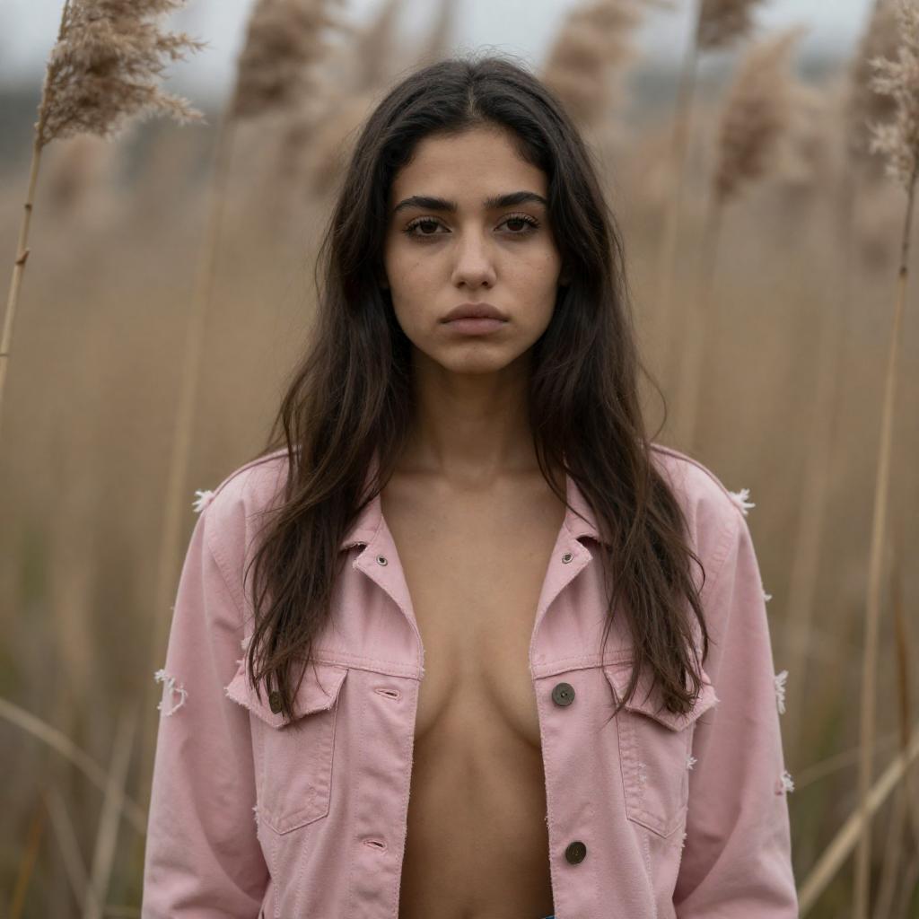 Photograph of a young woman with long, dark brown hair and light brown skin, standing among tall, dried reeds. She wears a tattered, light pink jacket, partially open, revealing her bare chest. Her expression is serious and slightly melancholic. The background is blurred, emphasizing the reeds and her focused gaze.