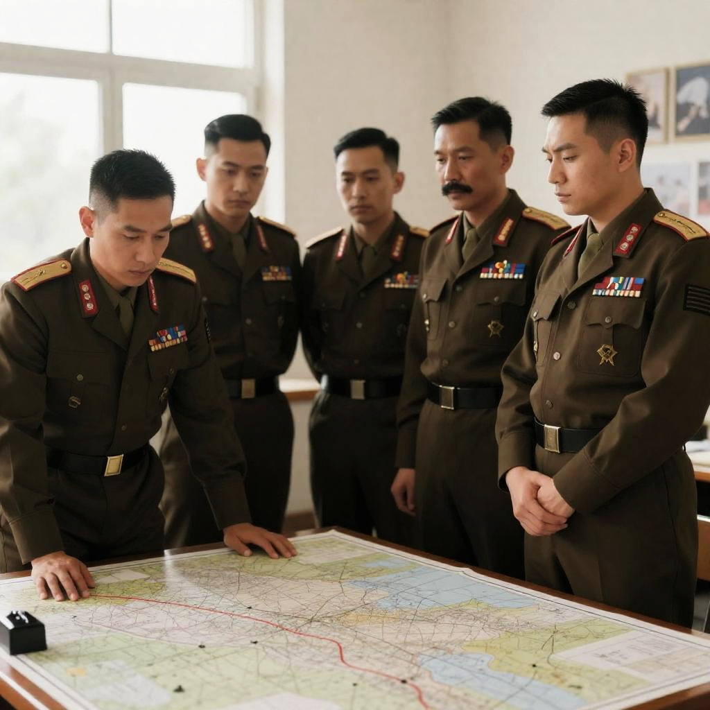 Photograph of five East Asian military officers wearing dark brown uniforms with various medals and insignias, standing around a large table with a detailed map. Four officers are standing closely together, while the officer on the left leans forward, examining the map intently. The setting features a window letting in natural light, and a wall with framed pictures in the background. The officers have serious expressions and one has a notable mustache.