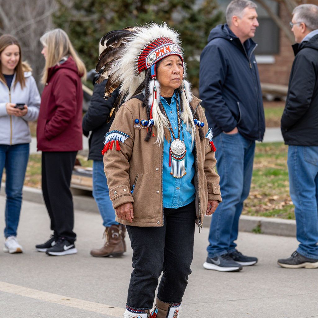 Woman in native american clothing with feathers on her head and accessories around her neck. The woman is wearing a brown jacket with a blue shirt and black pants. She is standing on a sidewalk with other people in the background.