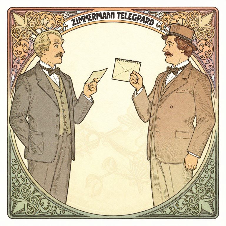 Zimmermann telegram cartoon, art nouveau influence, stylized characters representing diplomats, intricate border patterns, use of sepia and pastel tones, comic strip layout depicting message interception, historical attire and telegram graphic elements