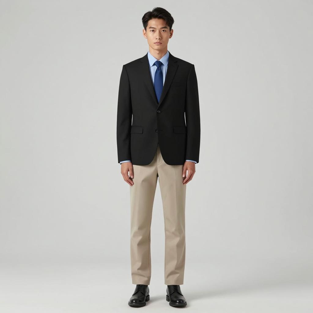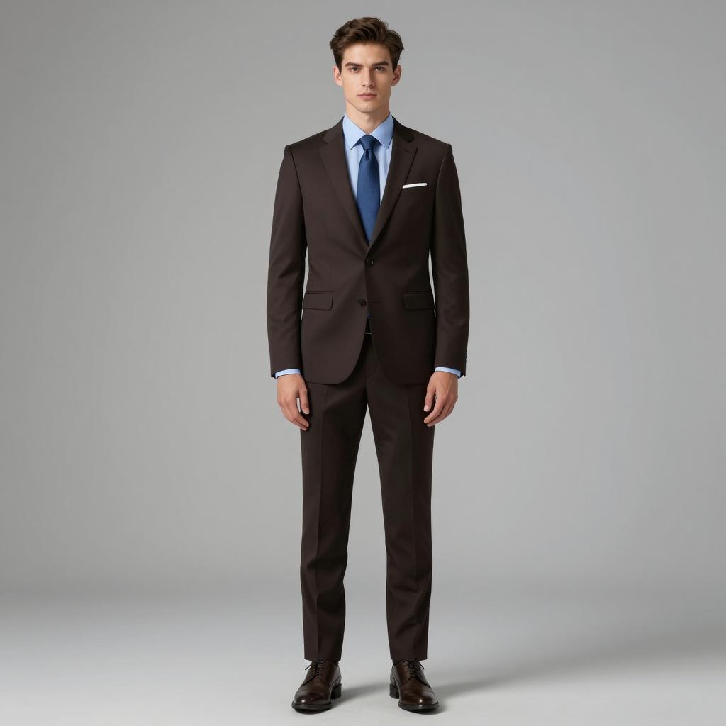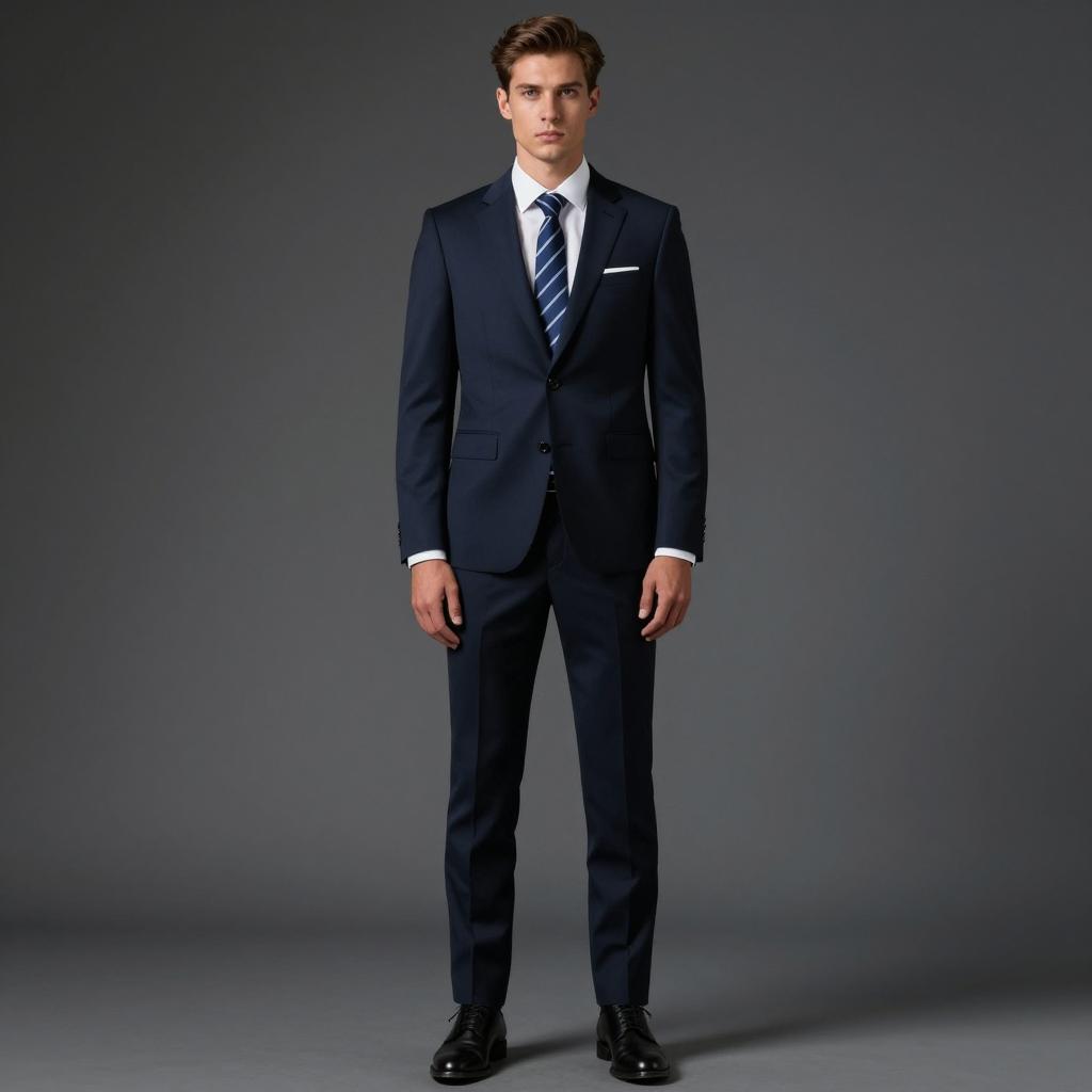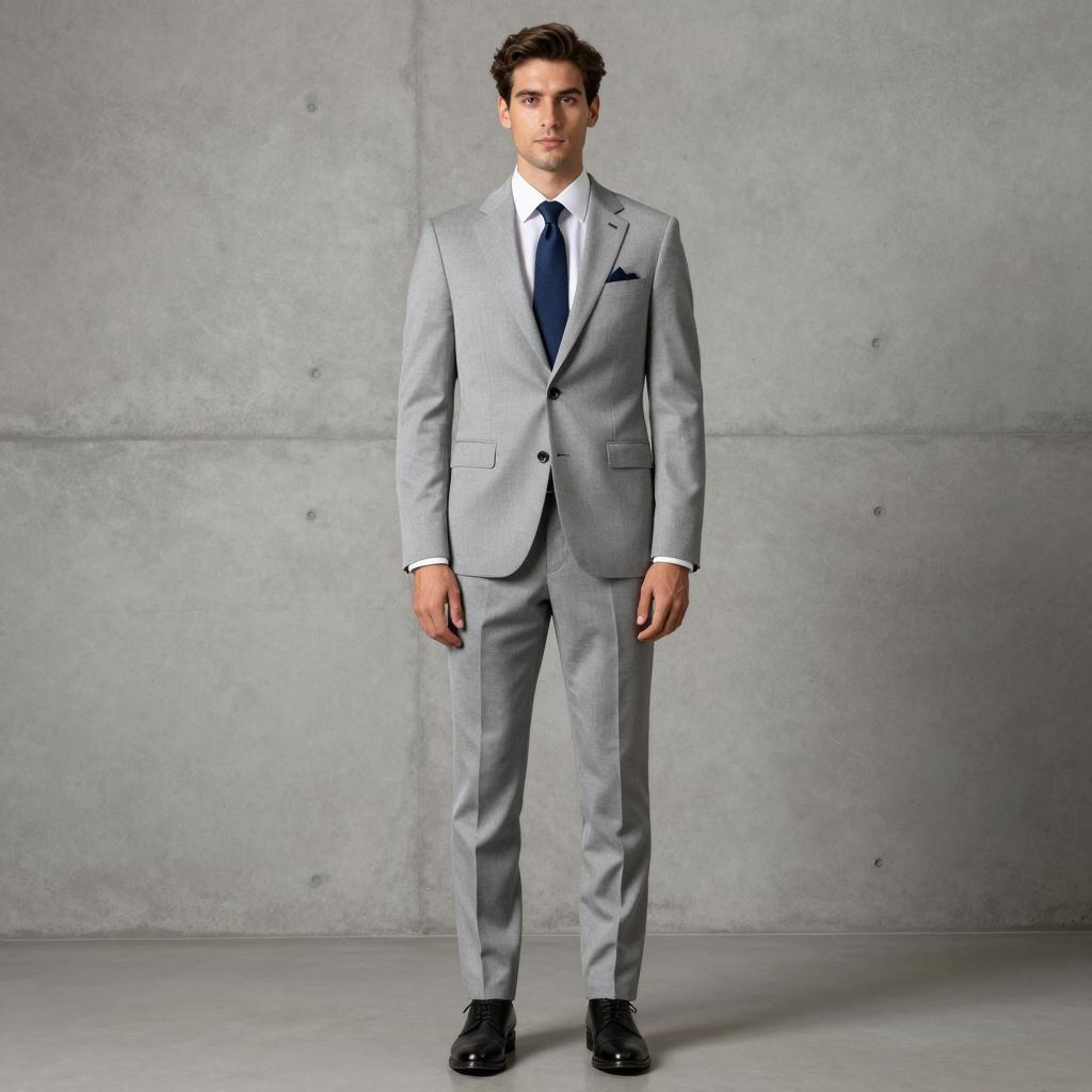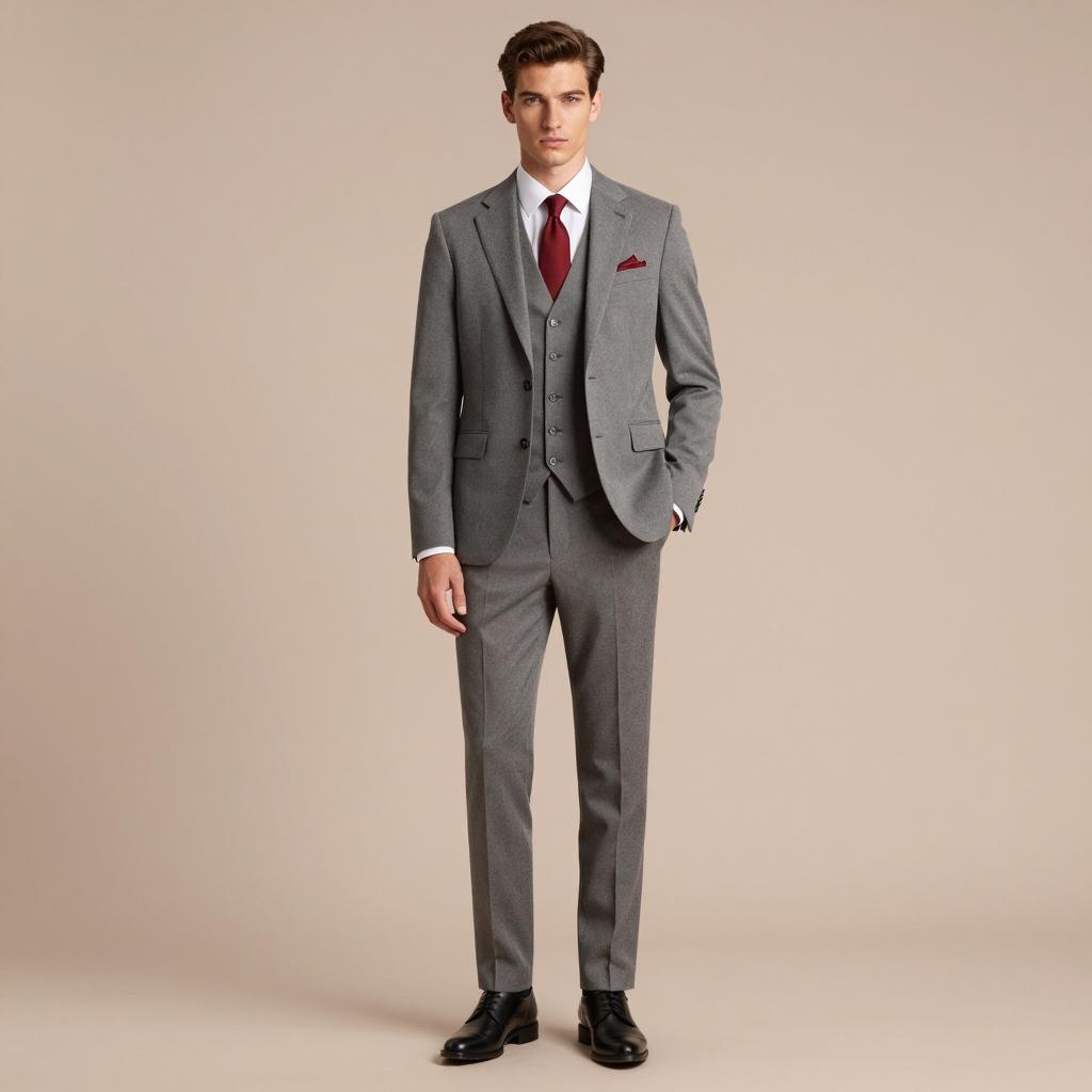 Full body portrait of a man with short hair and a serious expression, wearing a dark gray cardigan over a white shirt, paired with gray pants and brown dress shoes. He is standing in an elegant room featuring a wooden door, white wainscoting on the walls, and a polished hardwood floor, illuminated with warm lighting and subtle shadows.