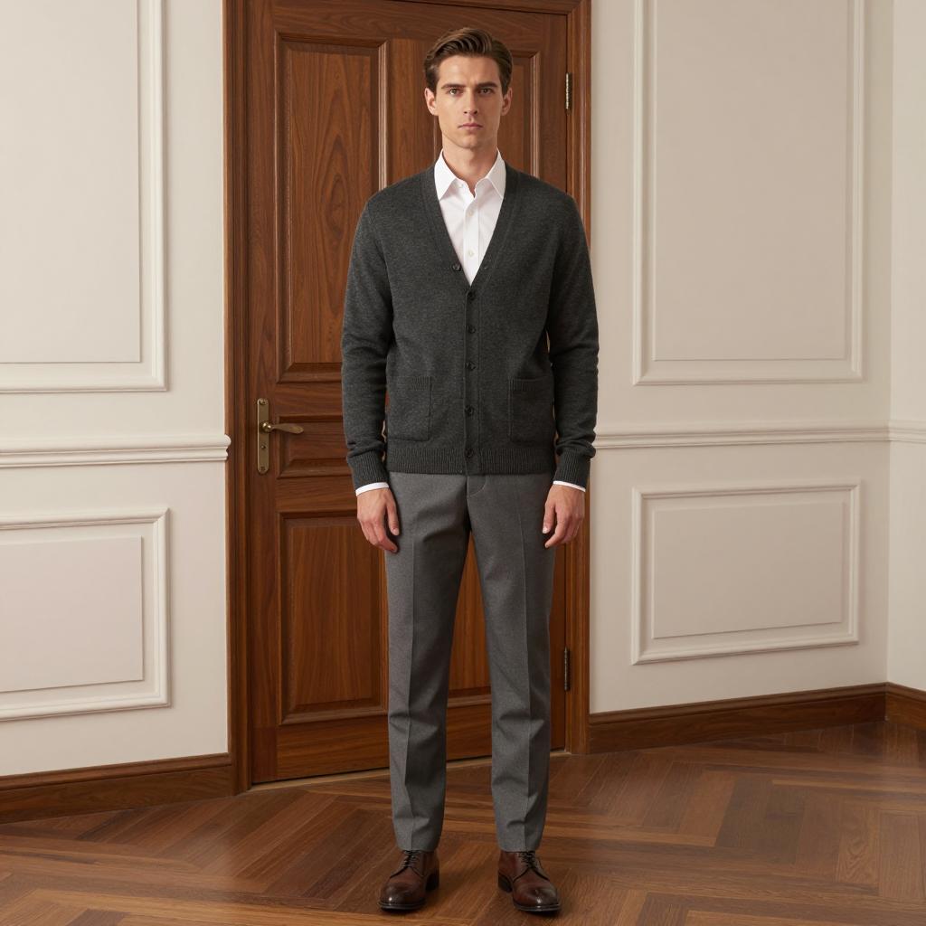 Cardigan sweaters costume, photograph of a man standing in a elegant room, full body shot, wearing dark gray cardigan, white shirt, gray pants, brown shoes, short hair, serious expression, wooden door in background, white wainscoting, polished hardwood floor, warm lighting, realistic style, subtle shadows