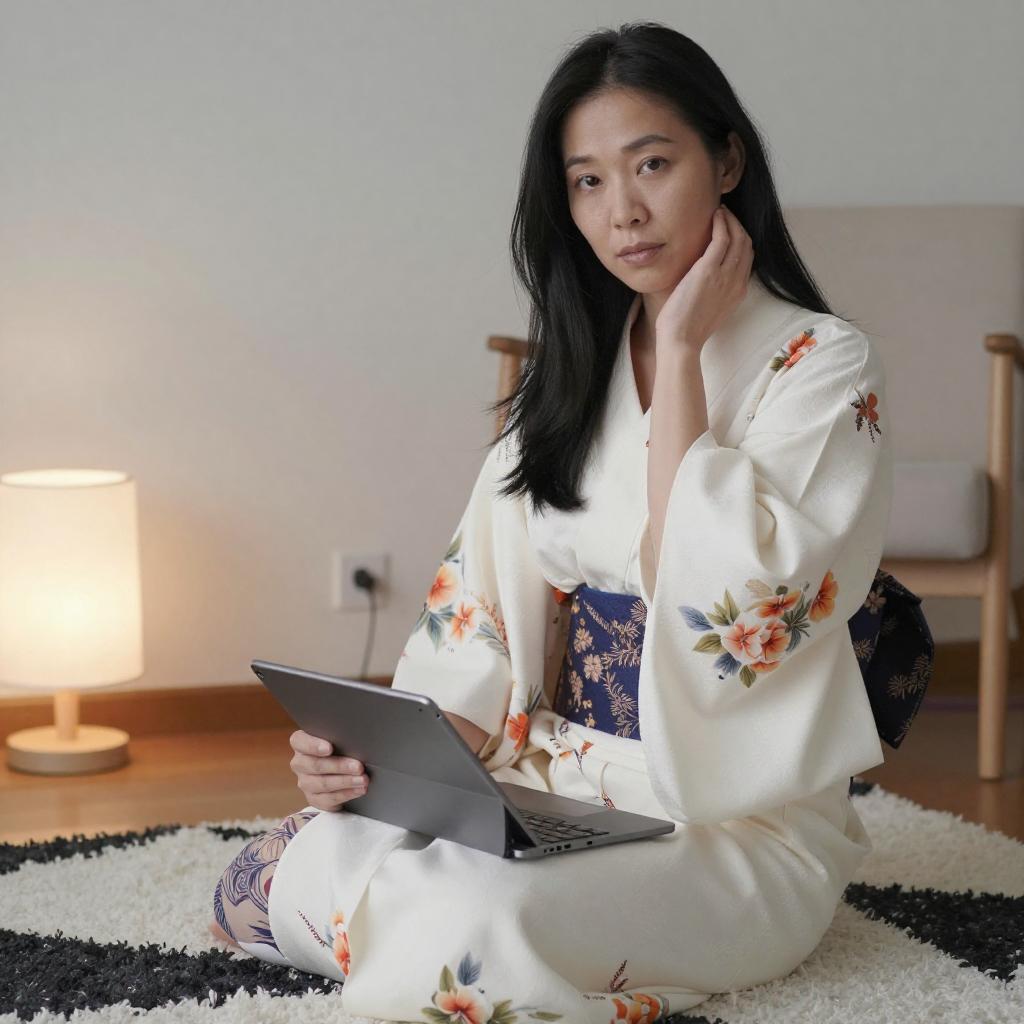 Photograph of an Asian woman with long pink hair, wearing a pink long-sleeve top, black cardigan, and black skirt, sitting on a wooden bench. She holds a book with a nature-themed cover, wearing black sandals. Background features lush green palm trees and a stone-lined pond. She gazes thoughtfully to the side.