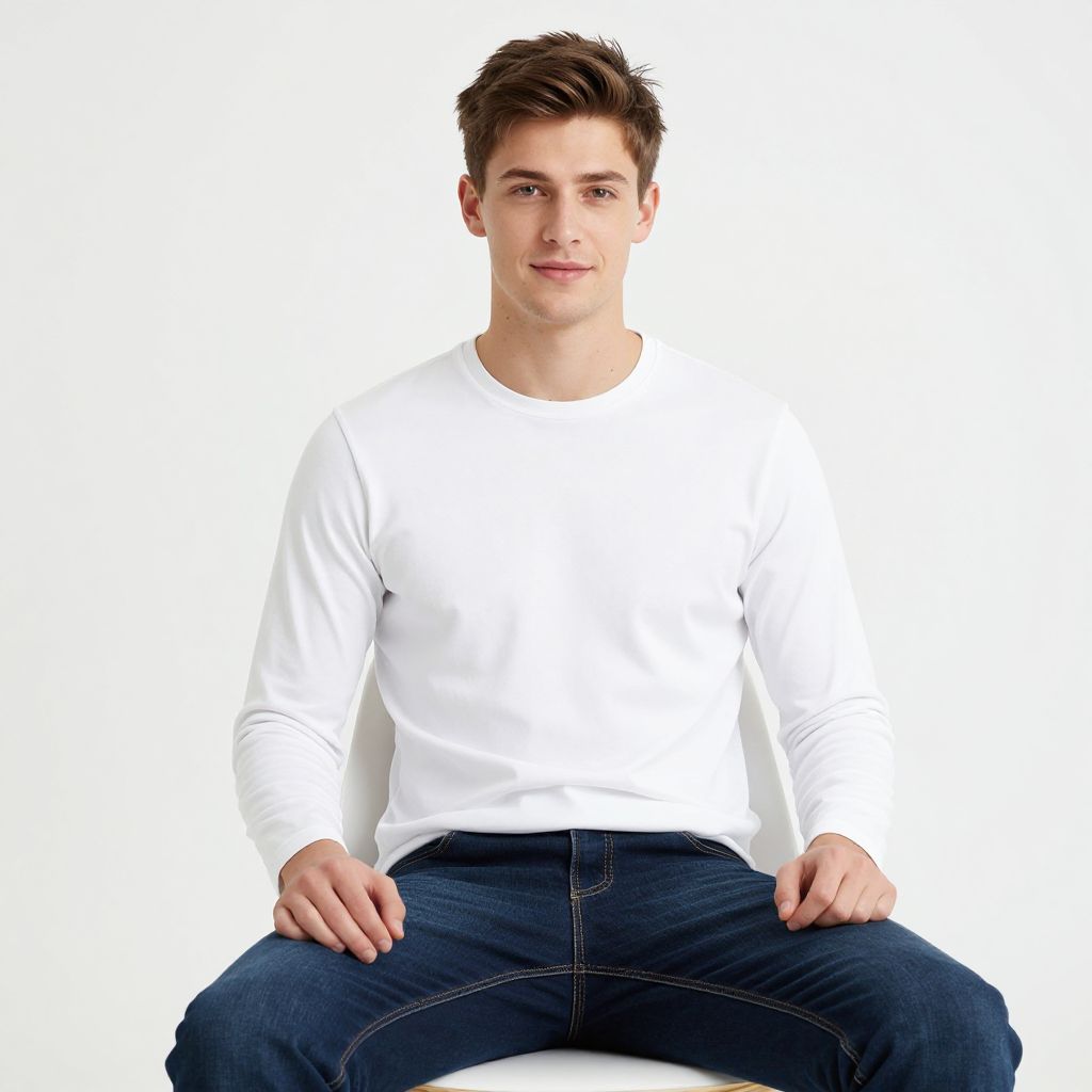Photograph of a young Caucasian man with short, dark brown hair and fair skin, sitting against a plain white background. He is wearing a plain white long-sleeve shirt and dark blue jeans, with his hands resting on his thighs. He has a slight smile and direct gaze towards the camera. His posture is relaxed, with legs slightly apart. The image has high contrast and sharp focus, emphasizing the simplicity and clarity of the subject's appearance and attire.
