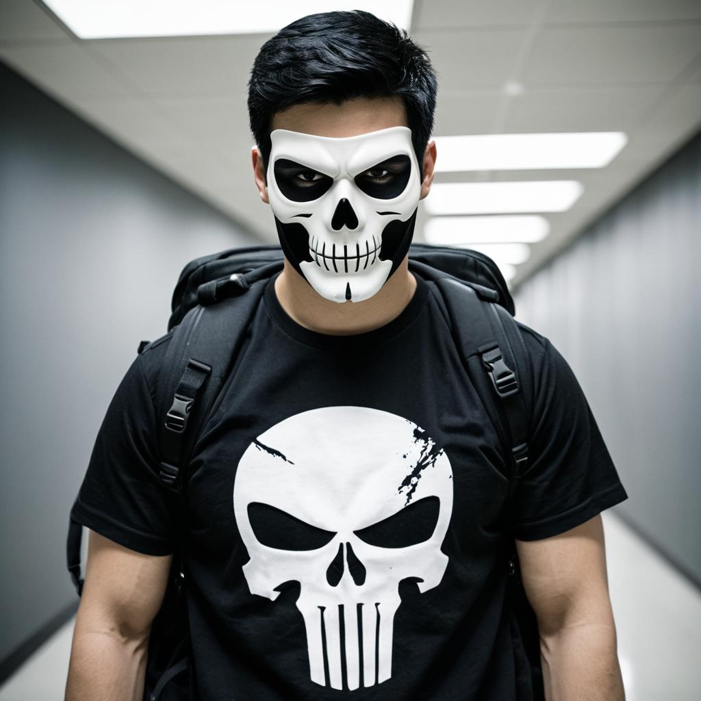 Punisher suit costume,male focus, 1boy, solo, black hair, mask, belt, shirt, short hair, black shirt, pants, indoors, realistic, black pants, looking at viewer, standing, facial hair, long sleeves