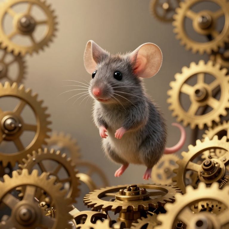 Photorealistic CGI of a gray mouse with pink ears and tail, mid-jump, surrounded by intricate golden gears, creating a steampunk-inspired