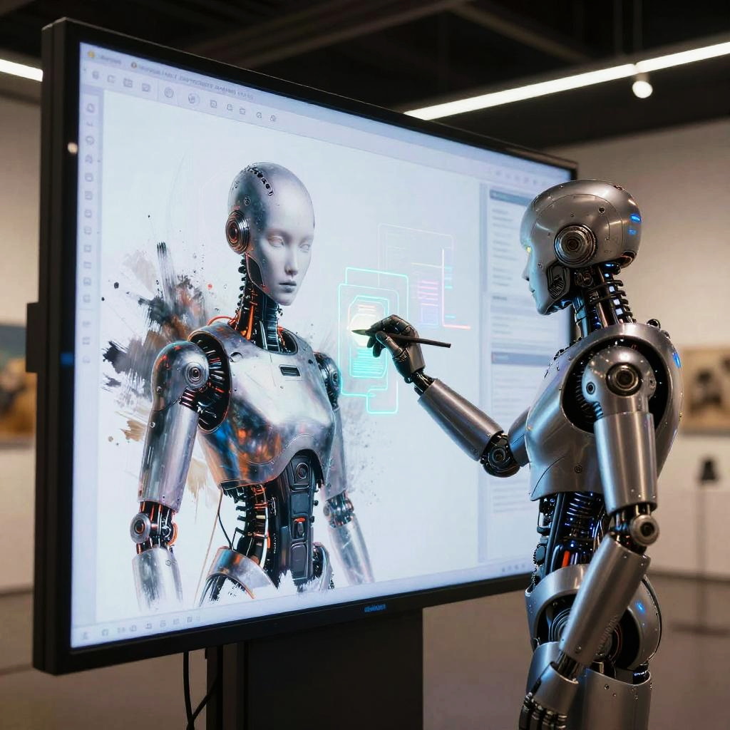 Art with ai, a sleek android artist meticulously crafting a masterpiece on a large digital screen, blending traditional brushstrokes and glowing holographic elements, in a modern gallery setting with ambient lighting and reflective surfaces