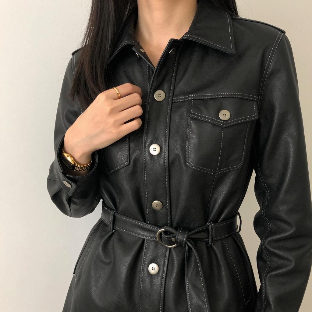 Photograph of a person with light skin, wearing a white turtleneck, black leather jacket, black leather pants, and white Calvin Klein underwear with Gucci . The person stands against a light gray wall, partially turned to the side. The jacket is open, exposing the turtleneck and underwear. The background is simple and unobtrusive. The person's face is not visible.