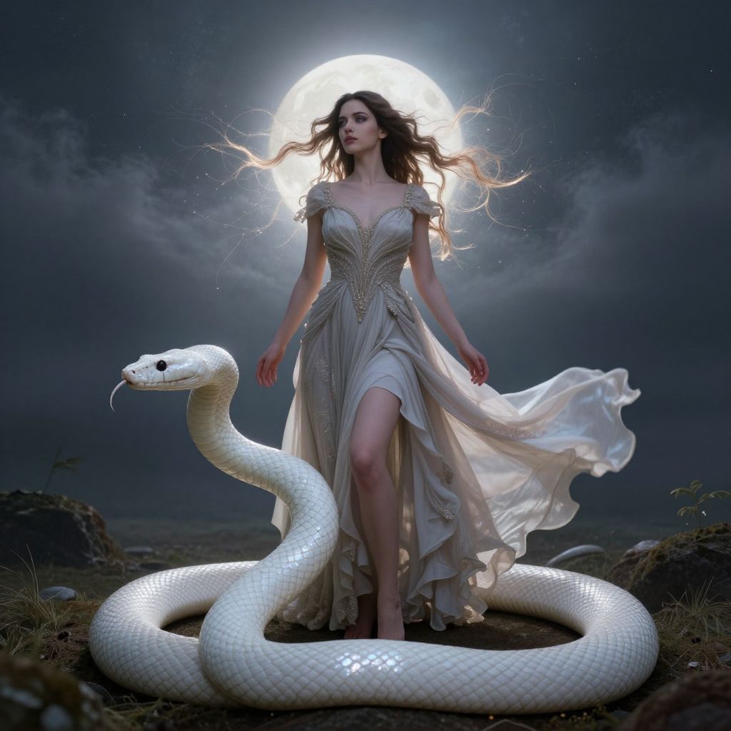 Digital artwork of a fair-skinned woman in a flowing white dress, standing amidst a glowing full moon, with a large white snake coiled around her