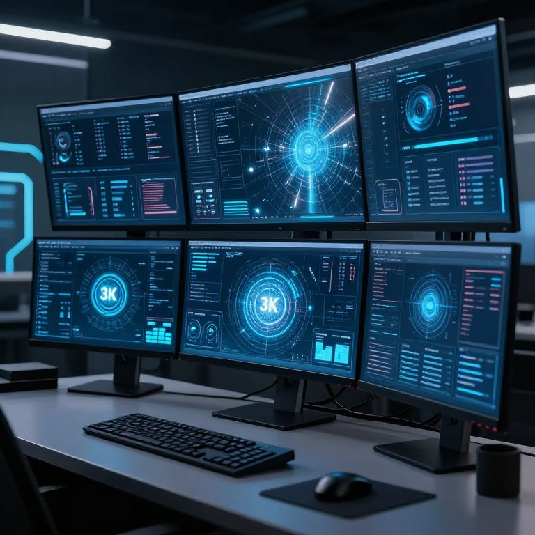 What is 3K resolution digital art, futuristic workspace with multiple ultra high-res monitors, clear detailed interfaces, glowing neon accents, cyberpunk aesthetic, advanced technology