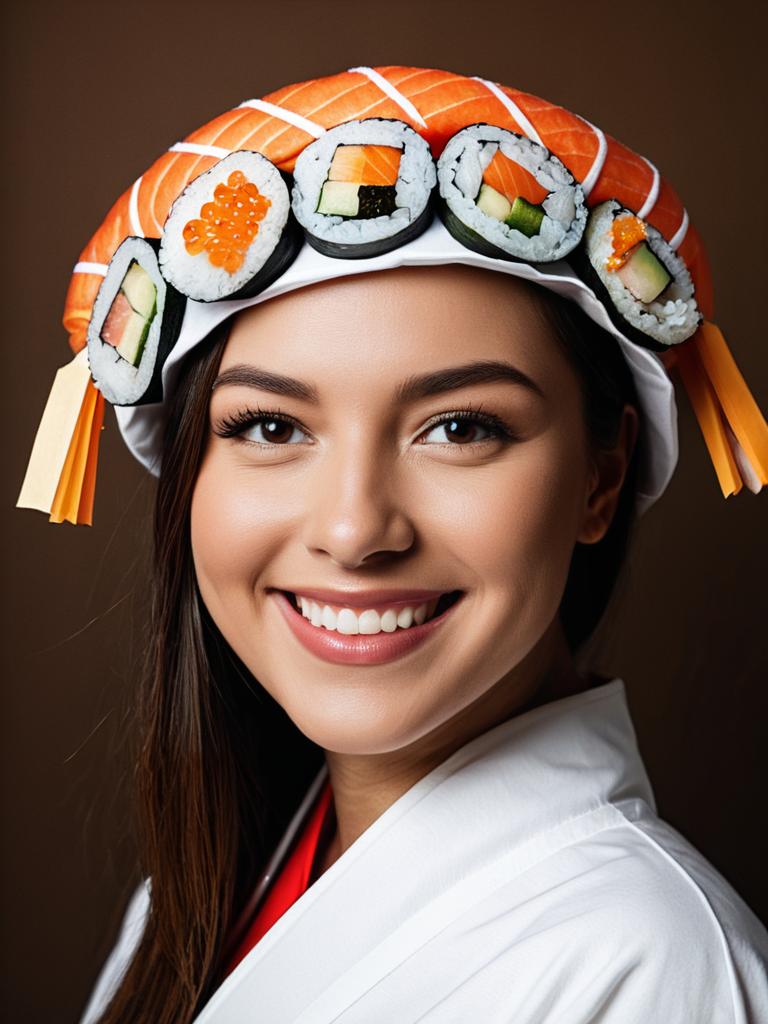 Close-up portrait of a cheerful young woman with medium skin tone and dark straight hair wearing a sushi roll-themed hat featuring realistic sushi pieces and salmon sashimi design. She is dressed in a white garment, smiling against a plain brown background.