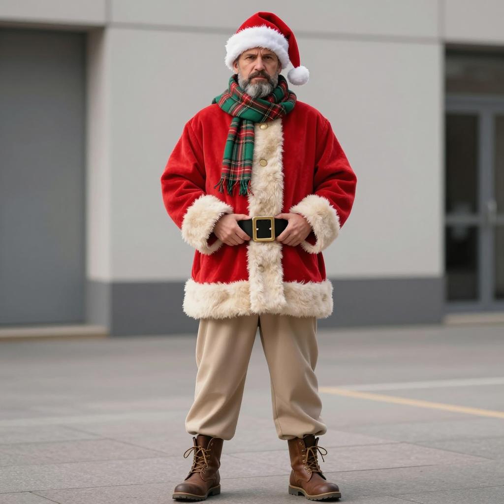 Photo of a man wearing a traditional red Santa Claus outfit with white fur trim and a black belt with gold buckle. He has a Santa hat and a beard, standing outdoors on a street during daytime with a clear blue sky. The background includes blurred trees, street lamps, and buildings.