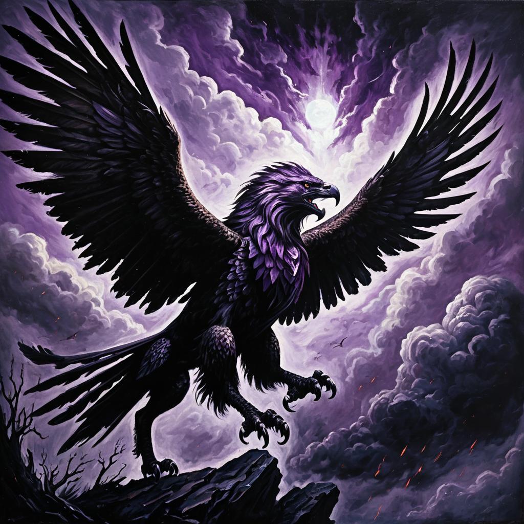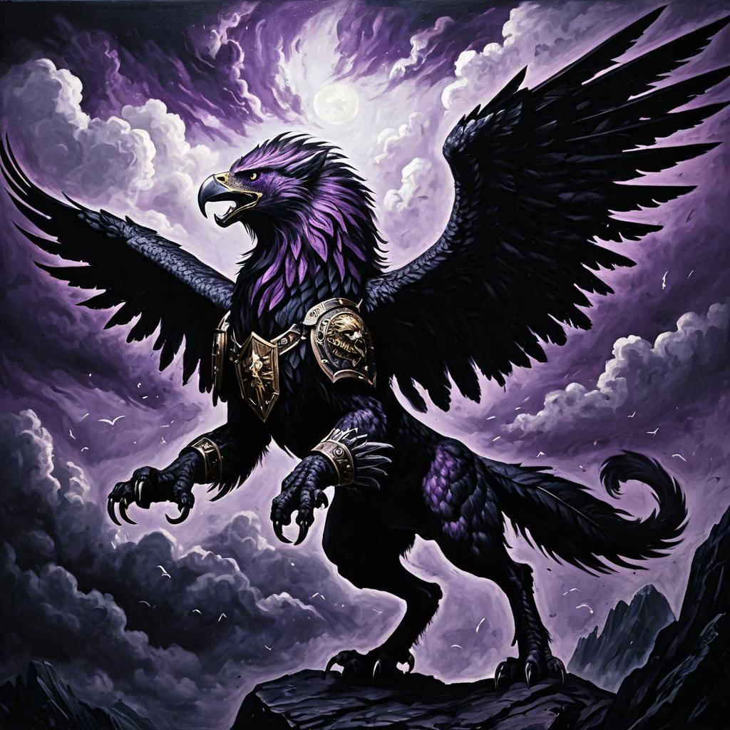 Warhammer fantasy RPG style oil painting of majestic griffon flying in sky, lion body with eagle head, dark purples and shadowy blacks, eerie moody lighting, rich and textured oil painting
