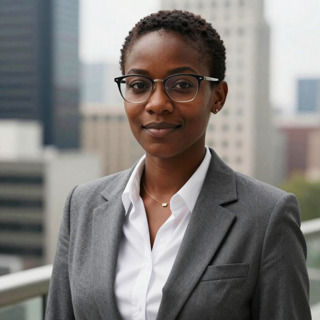 Dark skin with glasses, professional business attire, urban office environment, natural daylight, clear glasses frames, poised and professional demeanor