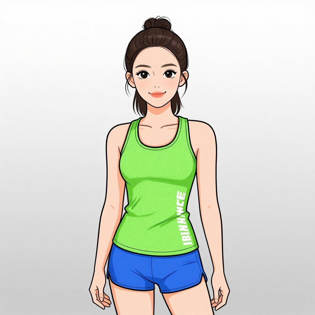 This is a digital anime-style drawing of a young woman with light skin and black hair in a high bun. She has large, black, almond-shaped eyes and a small, gentle smile. She wears a bright green, fitted tank top with white text on the right side and blue, tight-fitting shorts. Her arms are relaxed by her sides. The background is a simple gradient from white to light gray. The overall style is clean and colorful, emphasizing her athletic and casual appearance.