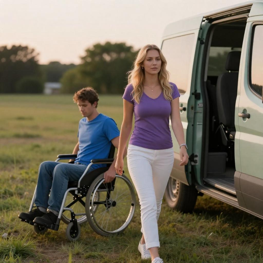 Photograph of two people in a grassy field at sunset. A blonde woman in a purple top and white pants walks in front, while a man in a blue shirt and jeans sits in a wheelchair behind her. Green van with open door on the right. Trees in the background. Man looks slightly downward, woman looks forward.