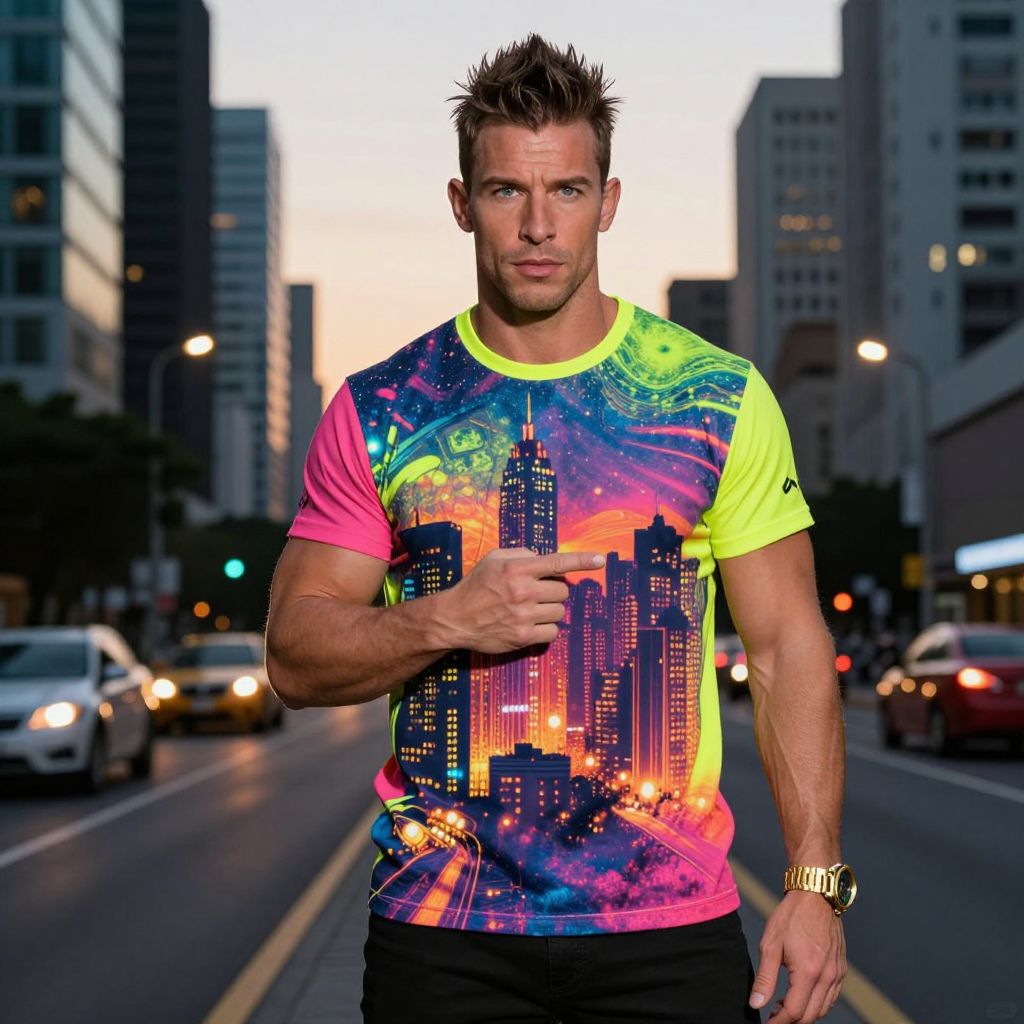Photograph of a handsome, muscular man with short, spiked brown hair and blue eyes. He's wearing a vibrant, neon-colored graphic t-shirt with cityscape lights, black pants, and a gold watch. He stands on a city street at sunset, pointing with his right hand, and has a confident expression. Tall buildings and city lights are in the background, with cars driving on the road.
