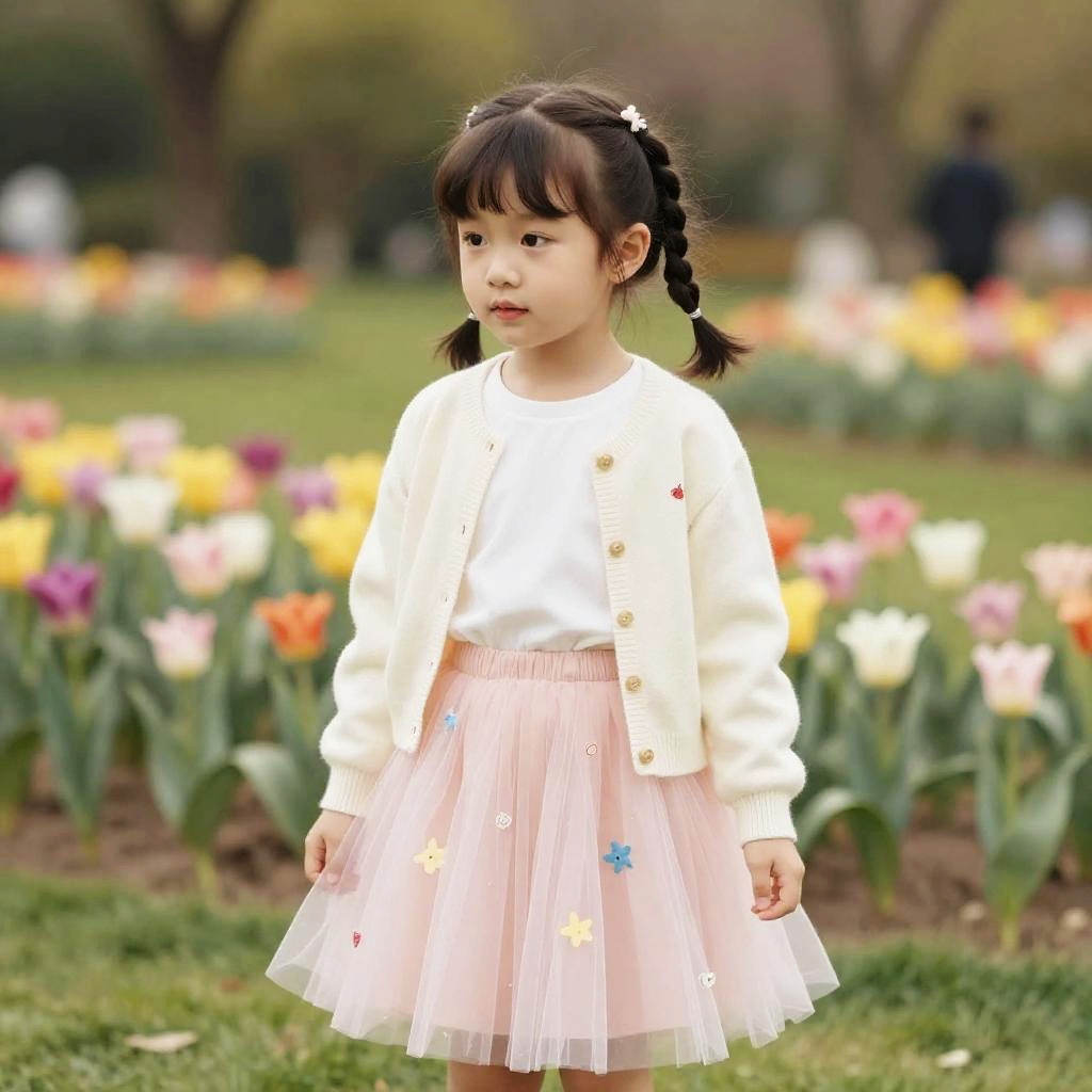 Portrait of a young Asian girl with mini twists hairstyle, wearing a cream cardigan over a white shirt and a pastel pink tulle skirt adorned with colorful pom-poms. She stands in a flower-filled park with tulips in the background, captured in soft ambient daylight in a fashion editorial style.