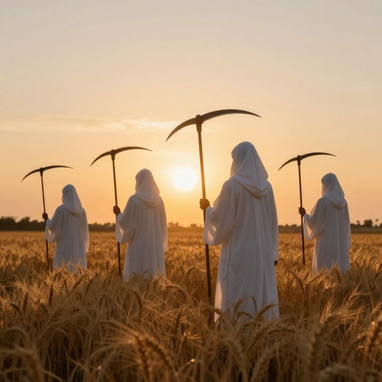 Silhouetted figures cloaked in white robes stand amidst golden wheat fields, each wielding a curved scythe as they face a radiant sunset that casts an ethereal glow over the scene.